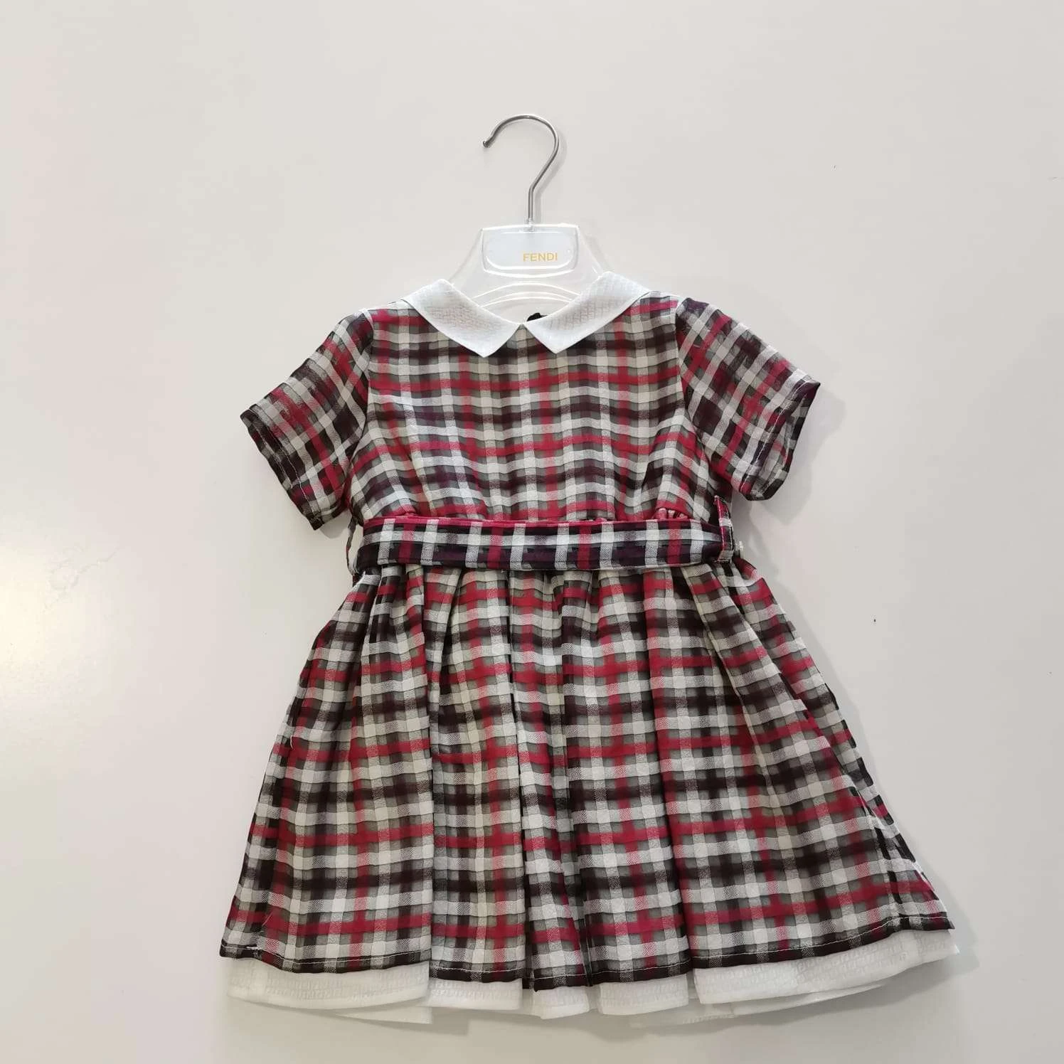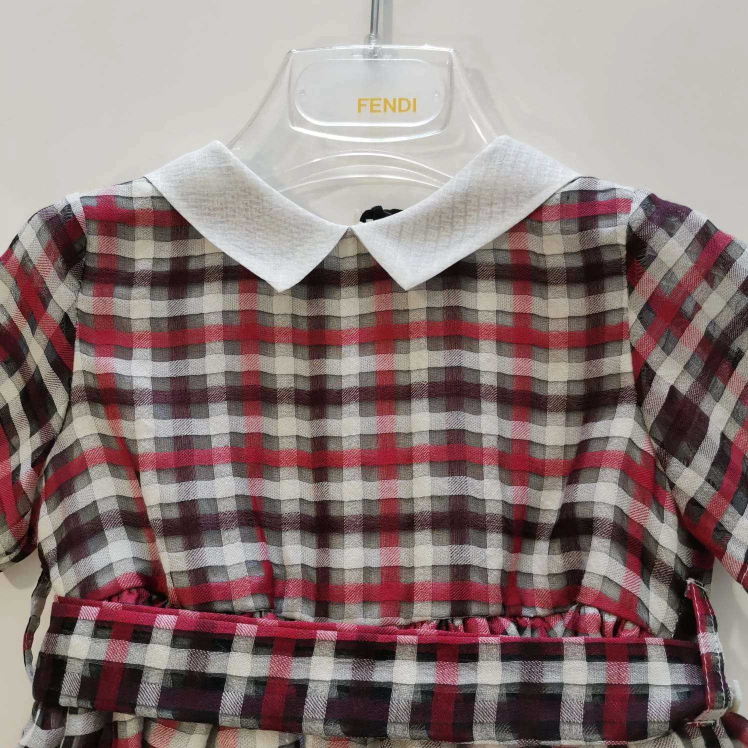 Abito in misto seta a quadri con colletto e cinta in vita.