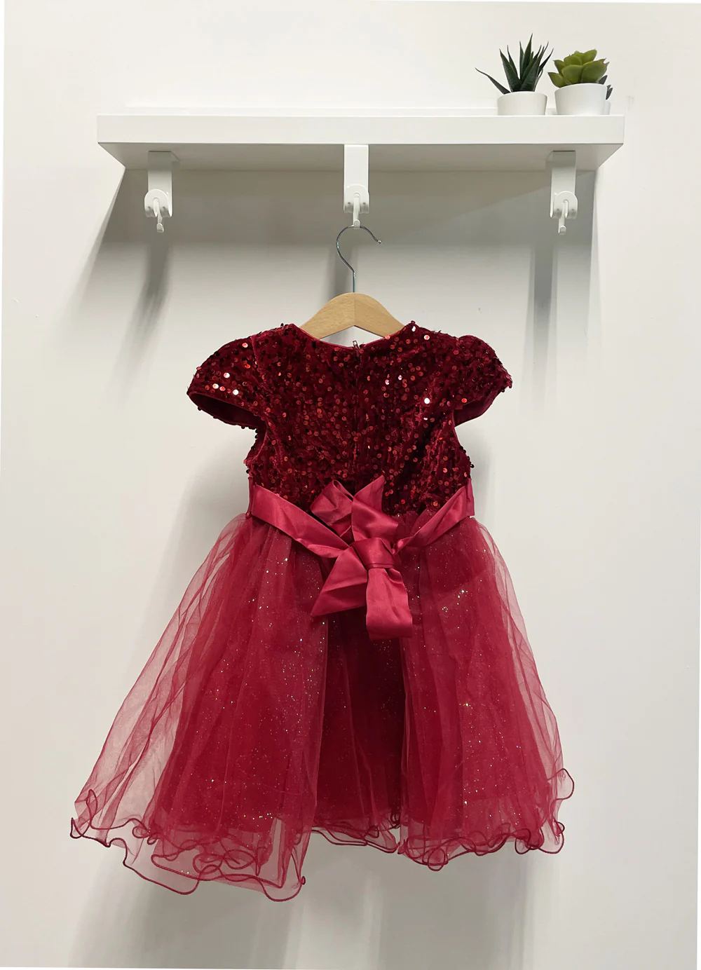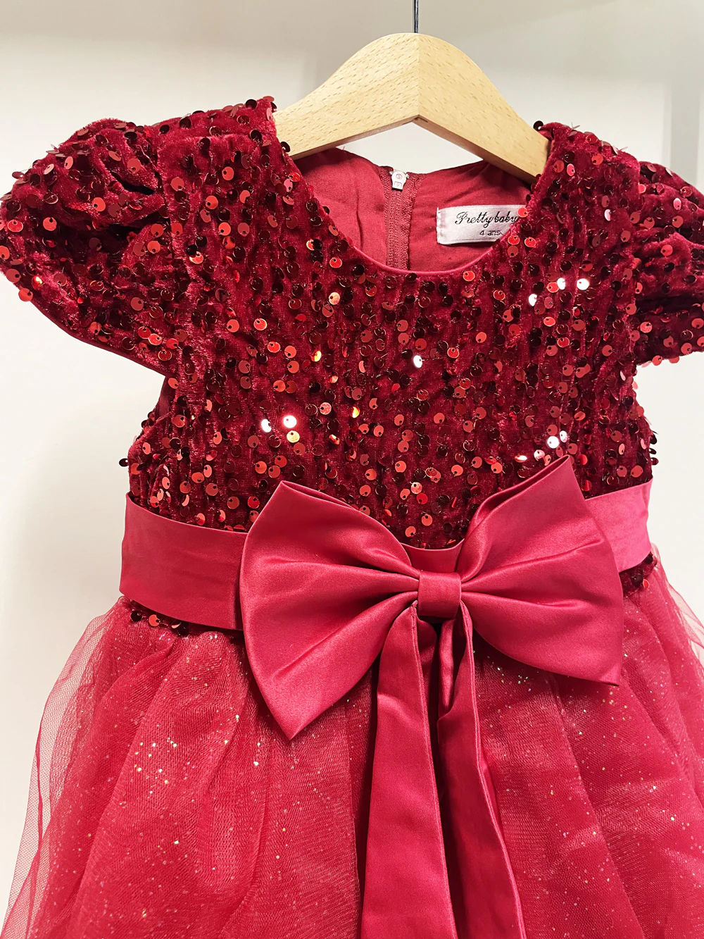 ( stagione autunno inverno ) Abito elegante. Parte superiore in ciniglia con paillettes. Cinturino con fiocco frontale e posteriore. Gonna in tulle con strass. Manica corta e zip posteriore invisibile. Composizione: 100% poliestere Tabella taglie 4anni 104cm 6anni 111cm 8anni 128cm 10anni 140cm 12anni 152cm 14anni 164cm