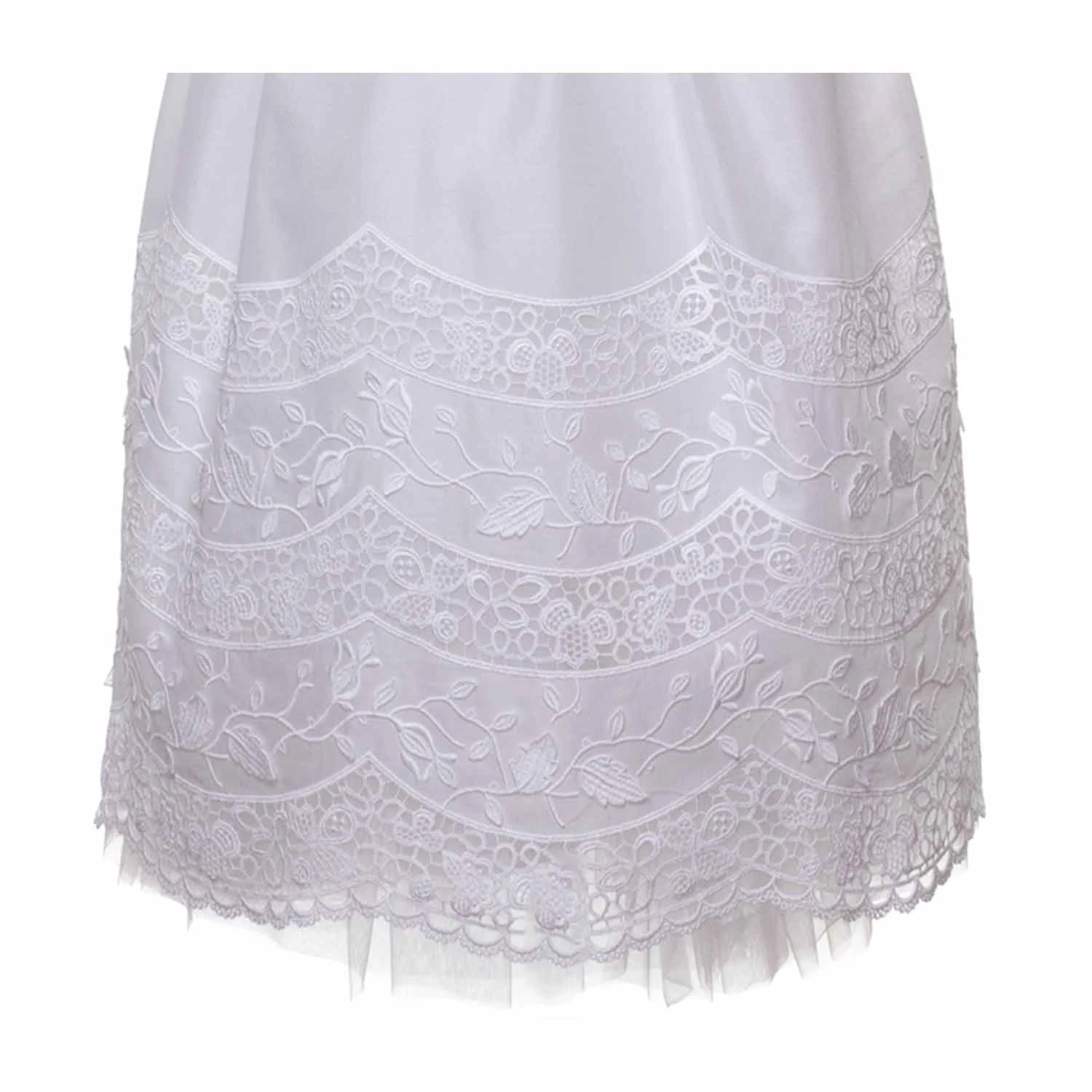 superficie bianca impreziosita dall’elegante ricamo sul fondo e dall’applicazione floreale in vita. Il nastro con allacciatura a fiocco sul retro.