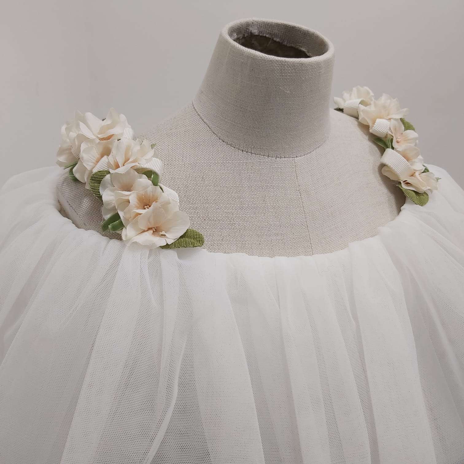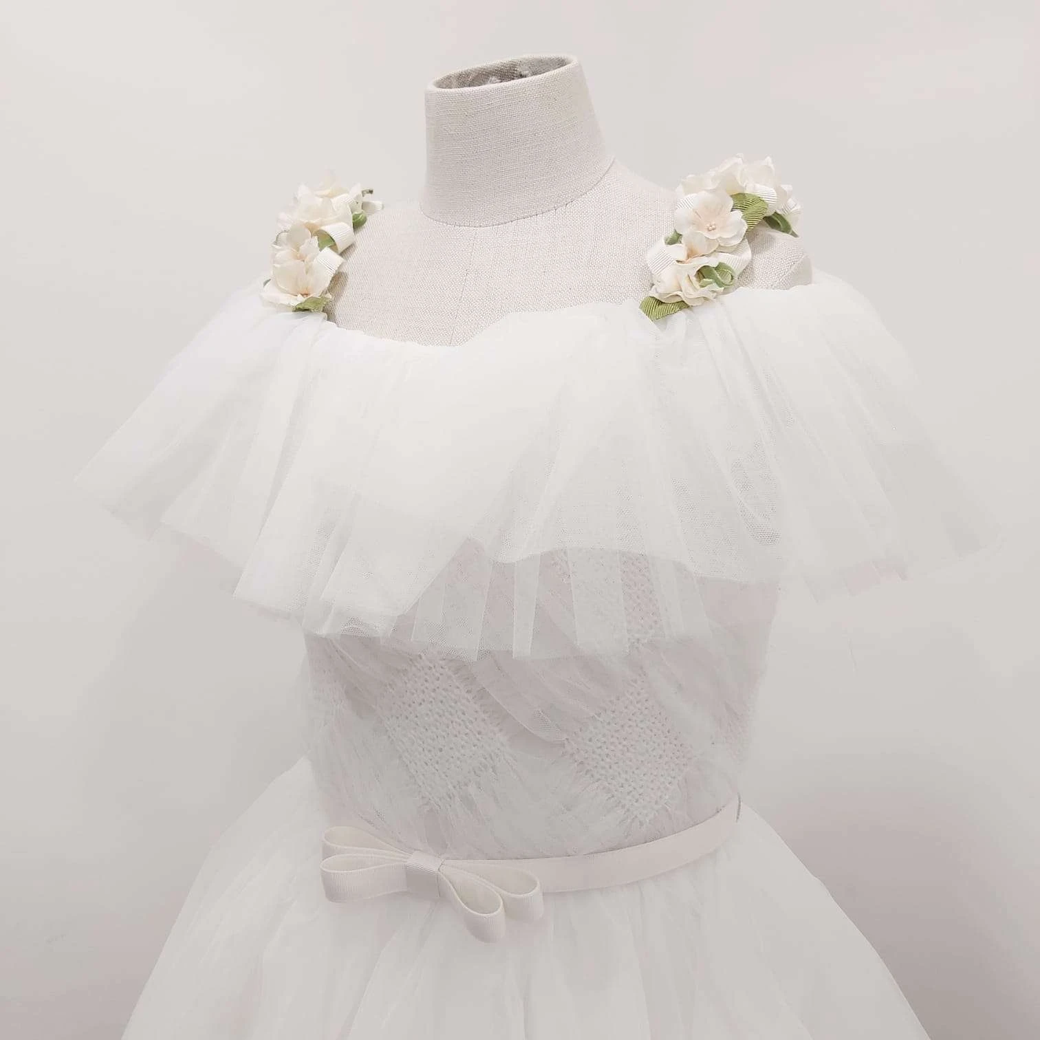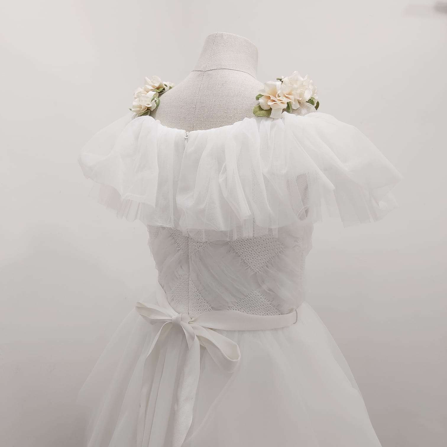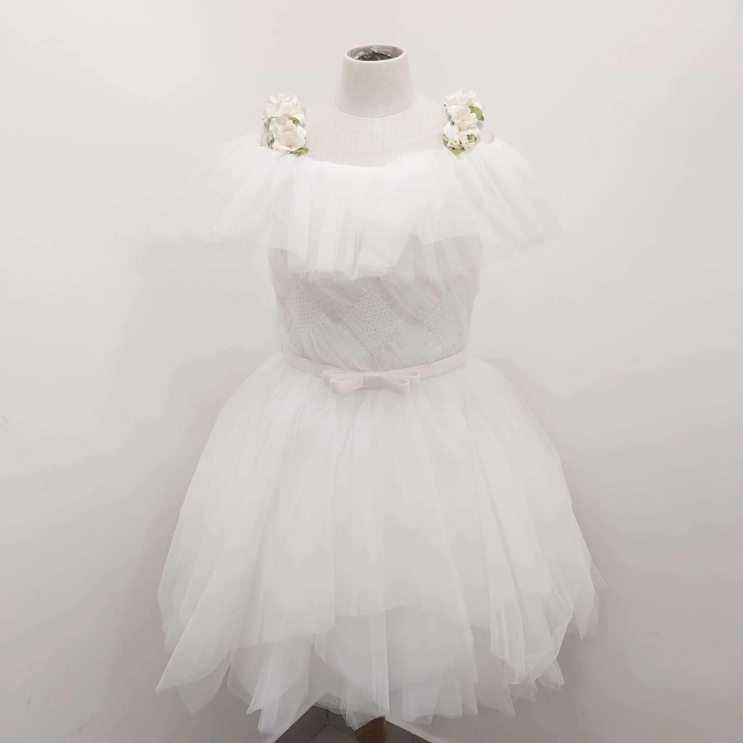 Abito asimmetrico bianco in tulle, scollo a barca e spalline di fiori, nastro in vita con fiocco