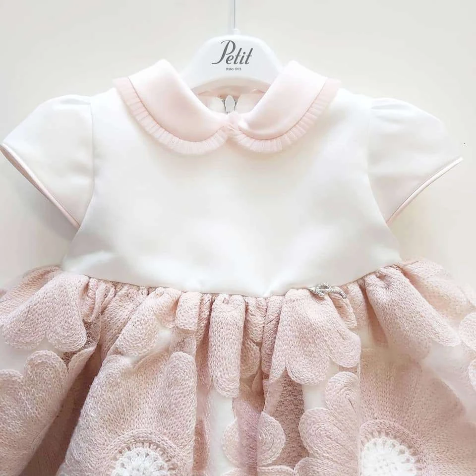 abito petit bianco con colletto rosa, gonna con fiori ricamati in lana