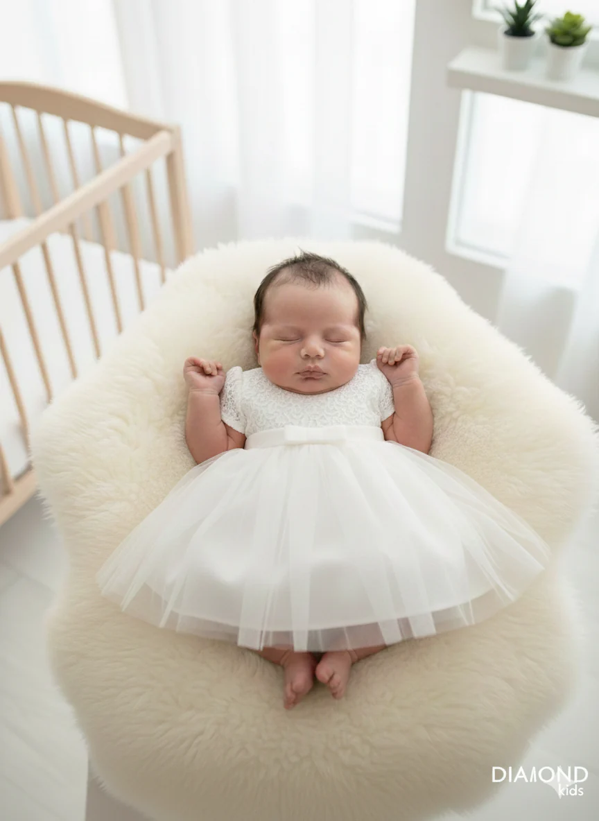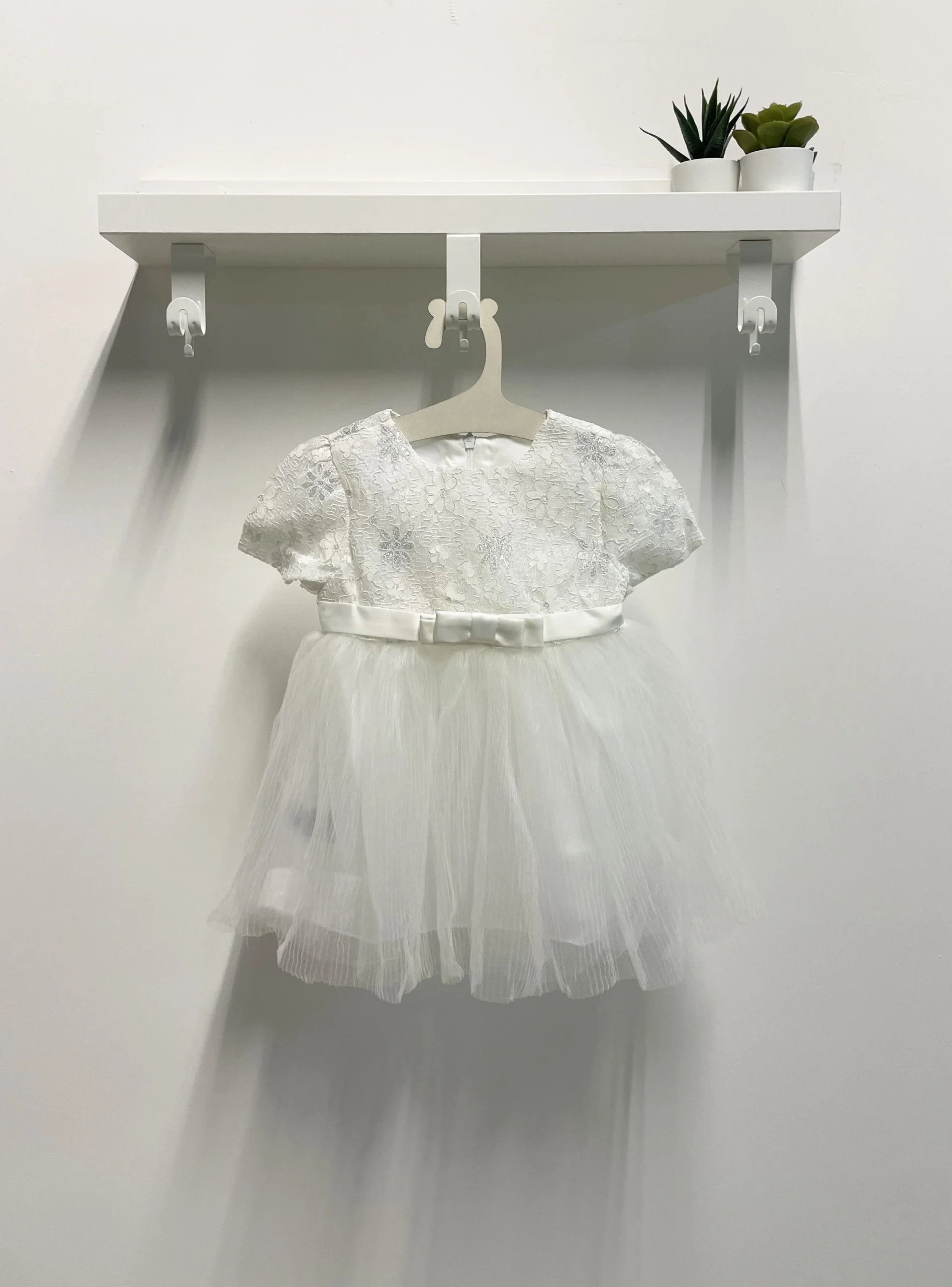 Parte superiore ricamata, in vita nastrino in raso con fiocco.
