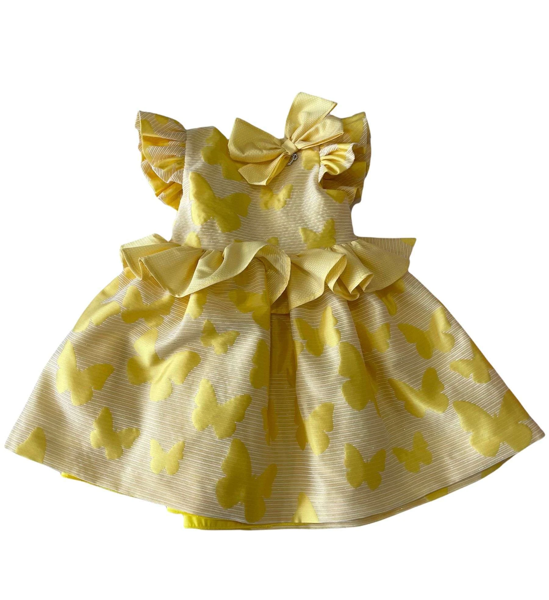 abito petit bambina giallo, fiocco laterale altezza spalla, ciondolo pendente, chiusura zip e fiocco dietro