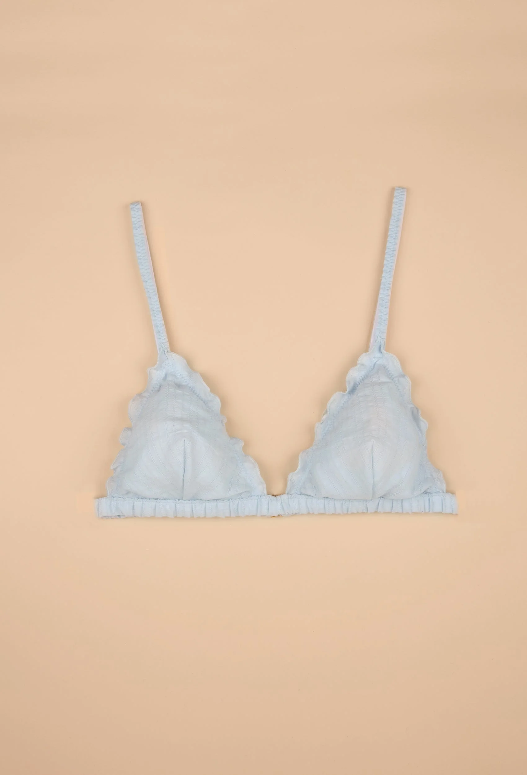 Bibi è una bralette in cotone ispirata alla silhouette retrò. Ha la base elasticizzata con una speciale chiusura a clip sul retro ed è caratterizzata dal design frou frou.