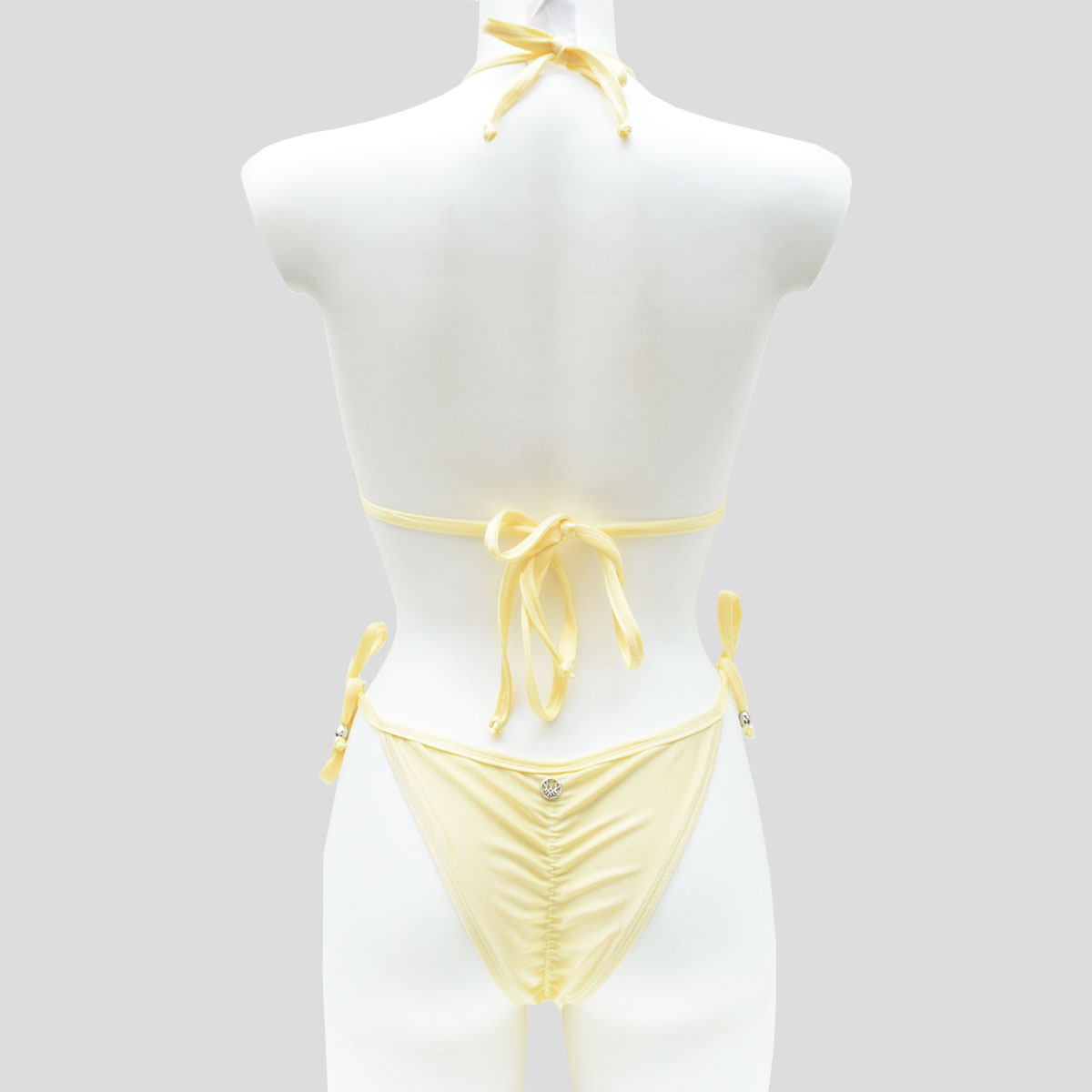 Bikini due pezzi con reggiseno a triangolo e slip con laccetti. Realizzato a mano, pensato per adattarsi al corpo con naturalezza. Essenziale, femminile, senza tempo.