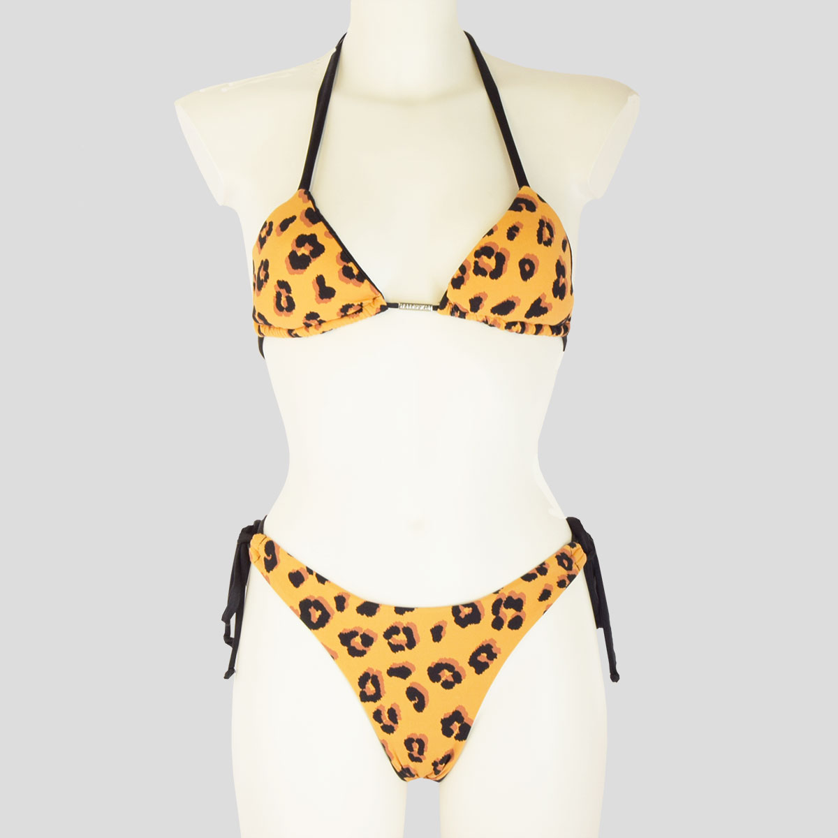 Il Bikini Malefica Eva unisce una stampa grafica maculato con dettagli neri e senape a una costruzione essenziale e senza tempo.