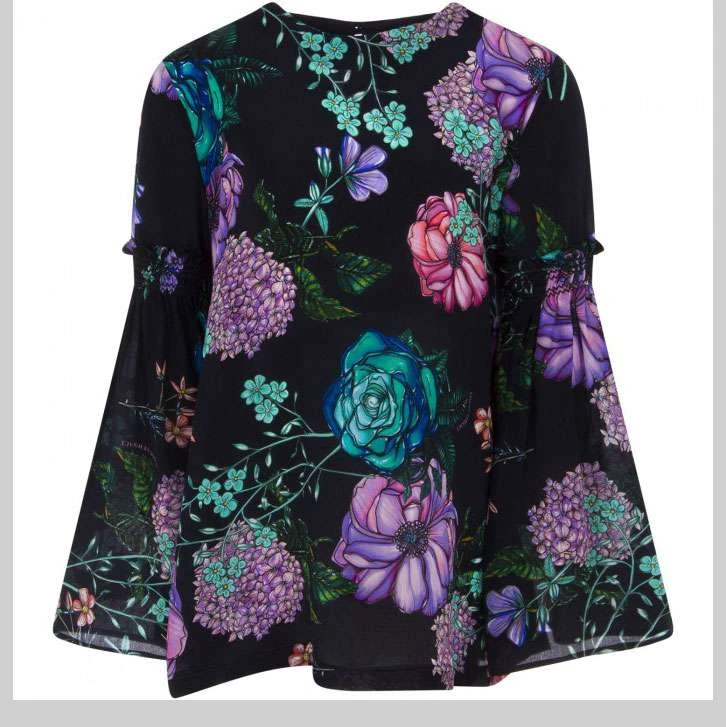 Blusa in seta nera, con collo tondo e maniche lunghe con arricciature a punto smock a mezza altezza. Spacco sulla scollatura posteriore con bottone. Fantasia floreale multicolor su tutta la parte anteriore e le maniche.
