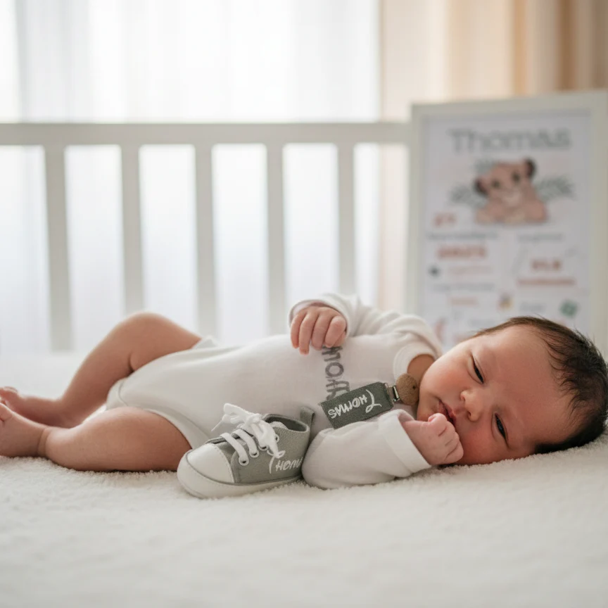Realizzata in 100% cotone, morbida e sicura per la pelle delicata del neonato. Il nome stampato la rende speciale, trasformandola da semplice accessorio a ricordo da conservare per sempre.