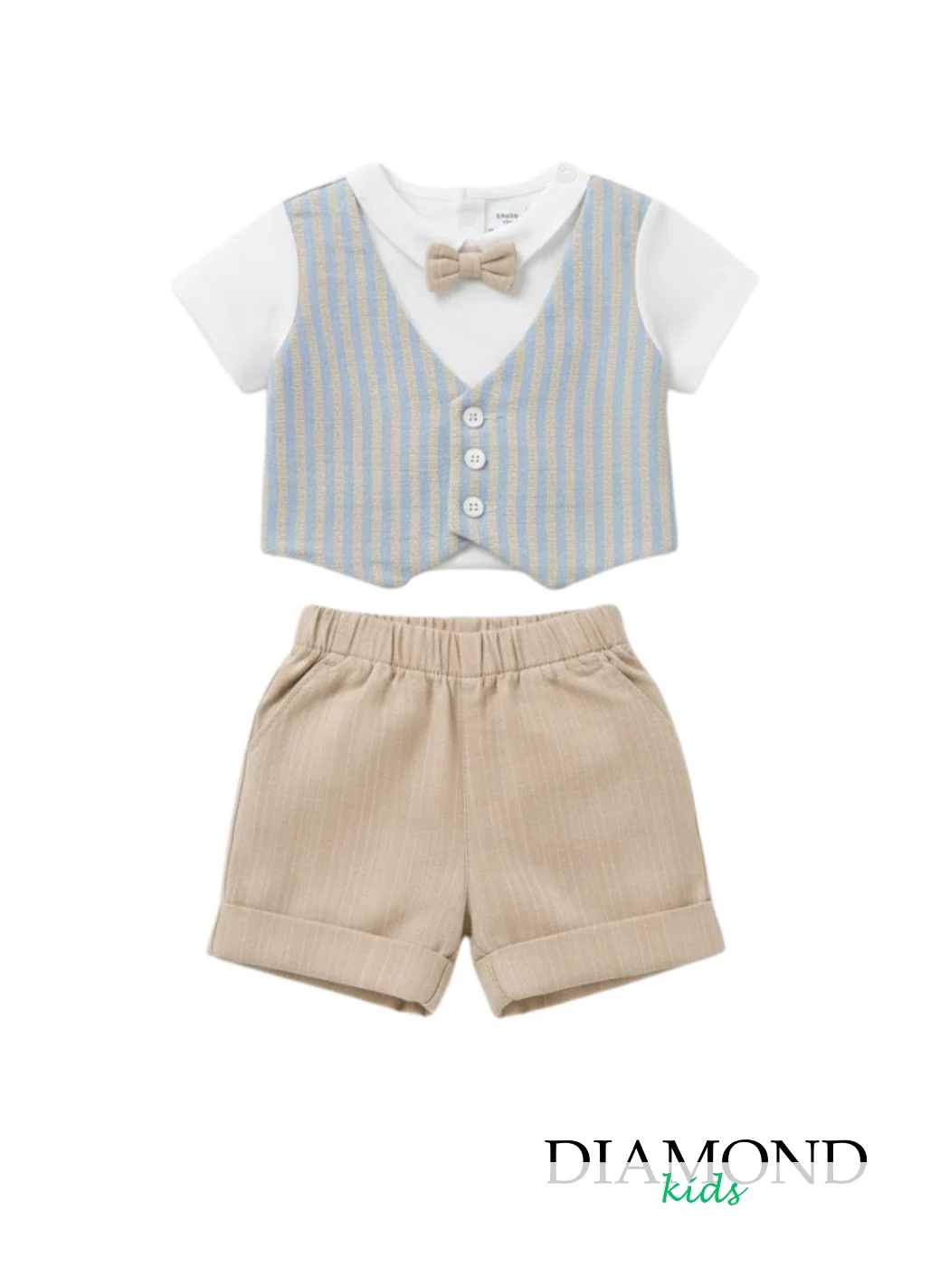 ( stagione Primavera Estate ) ID: NG3650 Clinico in cotone. Chiusura con bottoni, colletto e papillon removibile. Panciotto attaccato a righe. Shorts con elastico. Composizione: cotone 100% Tabella taglie 0/1 mesi = 45-51cm 1/3 mesi = 51-56cm 3/6mesi = 56-64cm 6/9mesi = 64-72cm