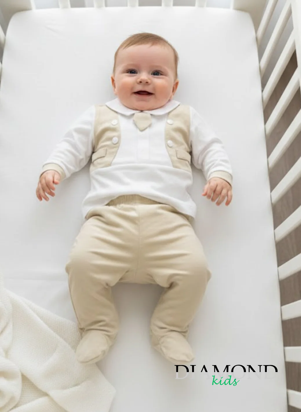 ( stagione Primavera Estate ) Clinico in cotone. Composto da ghettina e maglia. Ghettina con elastico in vita e piedini. Maglia con colletto, cravattina e bottoncini. Composizione: cotone 100% Tabella taglie 0/1 mesi = 45-51cm 1/3 mesi = 51-56cm 3/6mesi = 64cm
