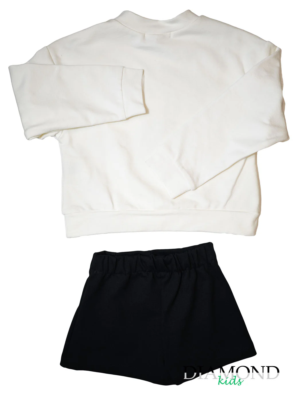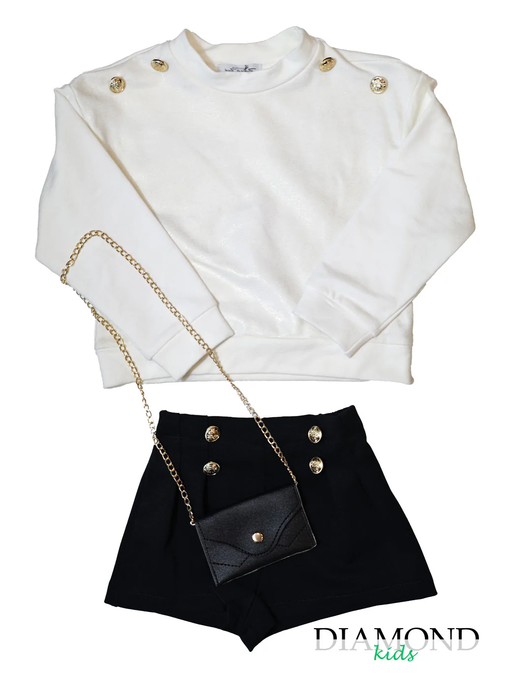 (stagione Autunno Inverno) Completo composto da felpa, shorts e borsa. Felpa manica lunga con bottoni dorati. Shorts con elastico in vita. Composizione: 95% cotone 5% elastane shorts: 68% viscosa 27% nylon 5% elastane Tabella taglie 3/4anni 99/104cm 5/6anni 111/116cm 7/8anni 123/128cm 9/10anni 134/140cm 11/12anni 145/152cm