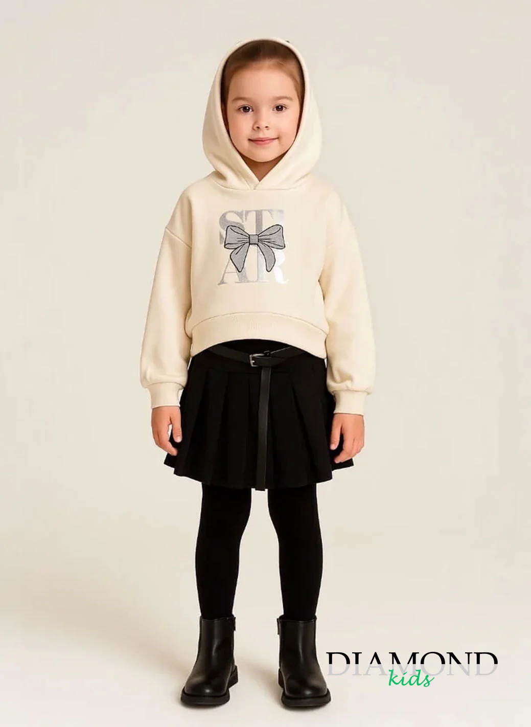 ( stagione Autunno Inverno ) Completo gonna e felpa. Felpa con cappuccio a maniche lunghe, arricchita da una stampa con fiocco applicato sul davanti. Gonna a pieghe con cintura abbinata. Composizione: 95% poliestere 5% elastan Tabella taglie 3 anni 100cm 4 anni 104cm 5 anni 108cm 6 anni 111cm 7 anni 116cm