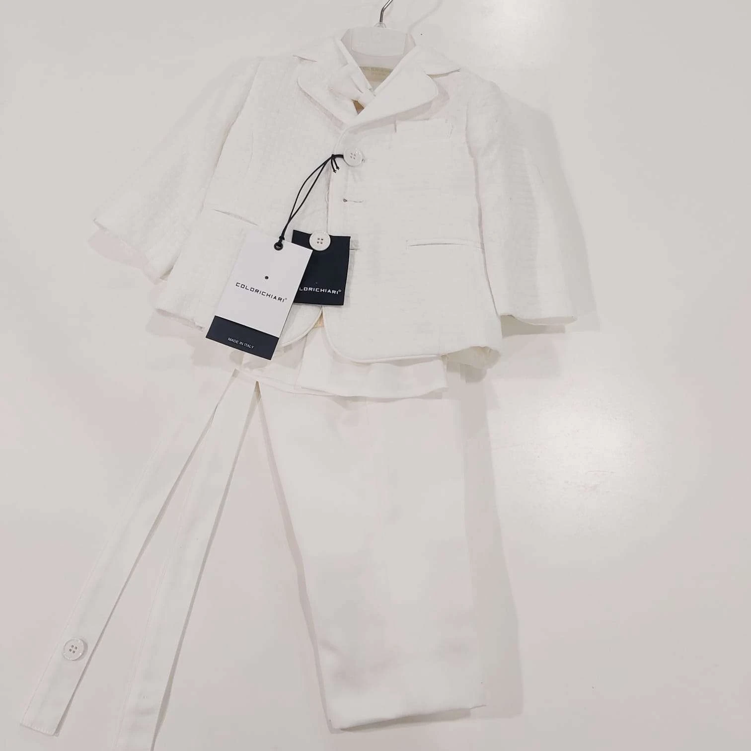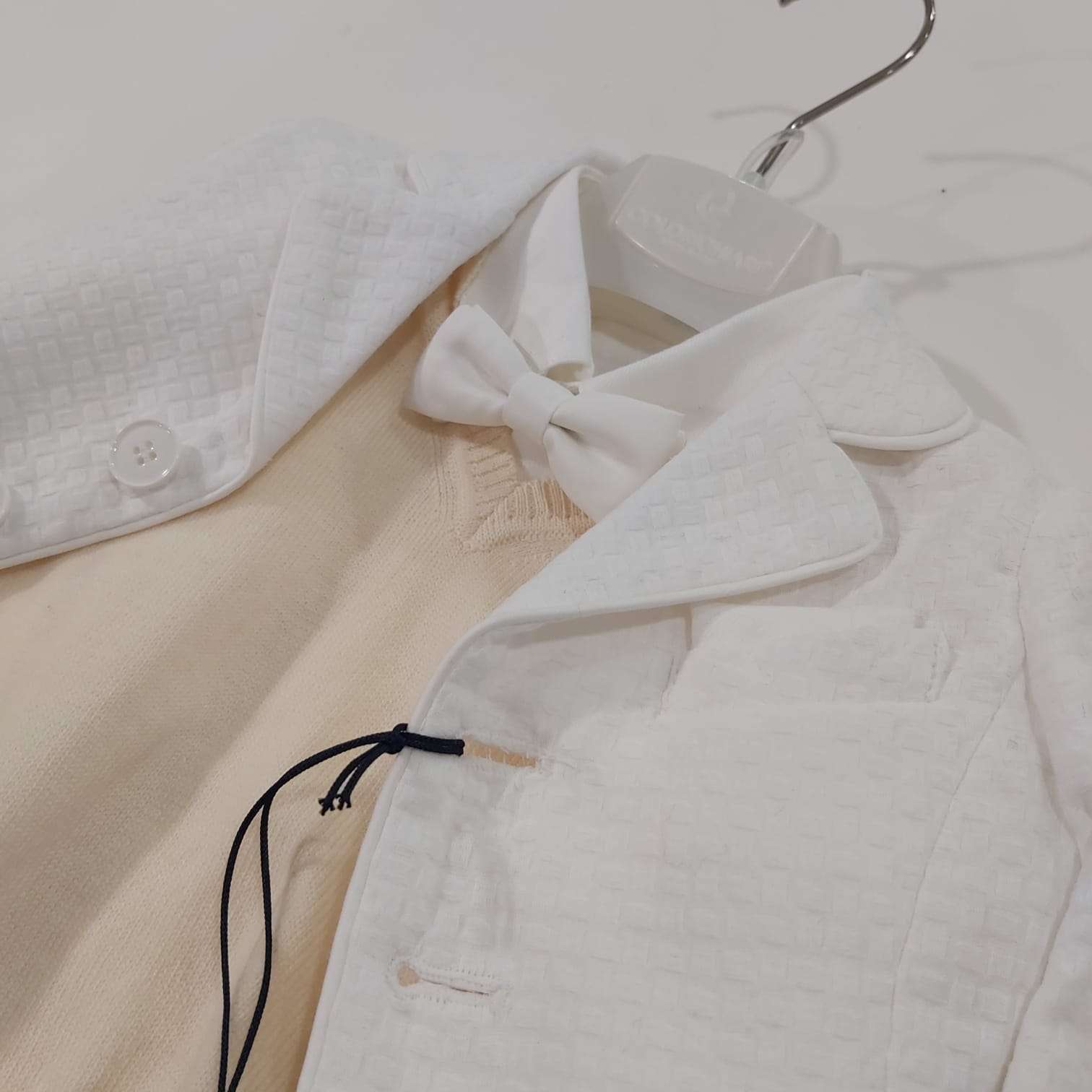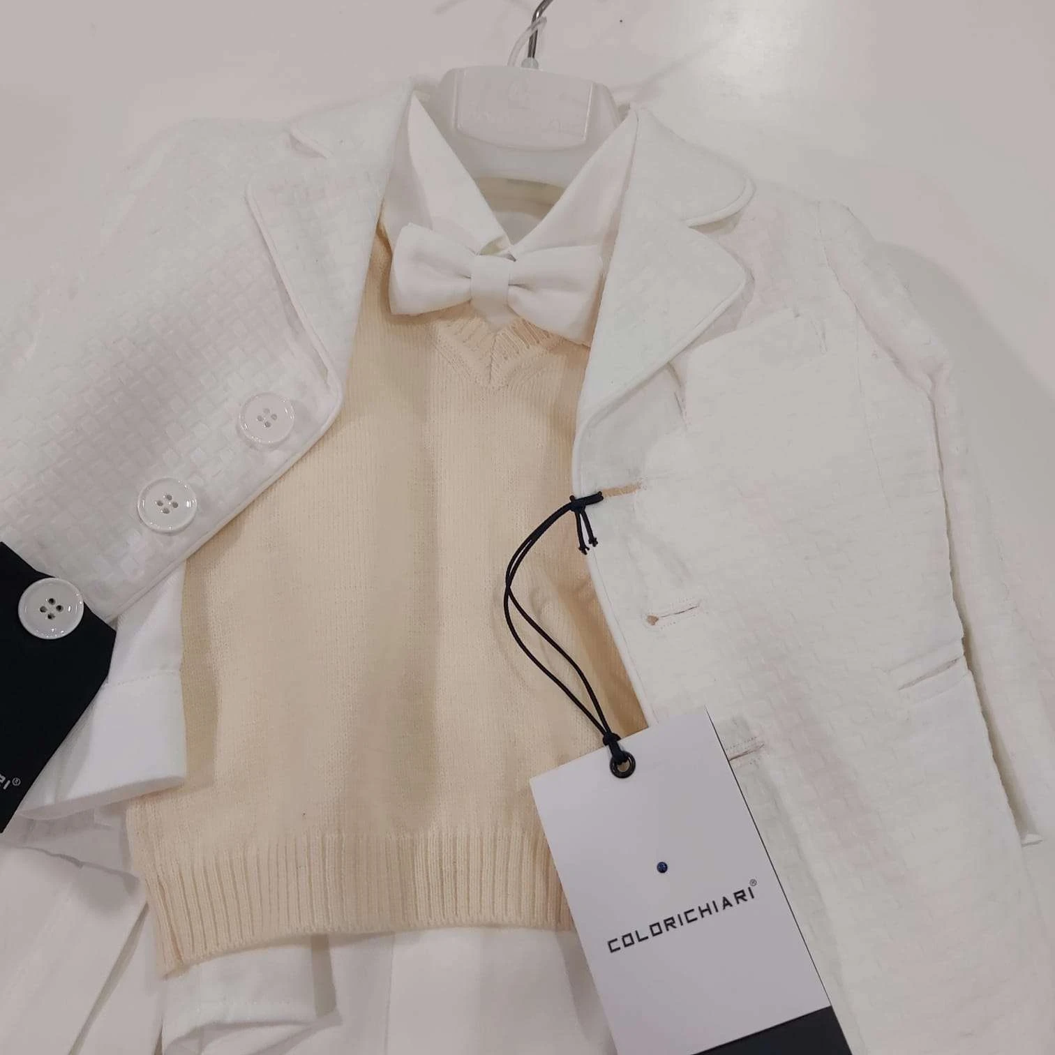 Completo Colori Chiari battesimale, giacca bianca e papillon bianco, camicia bianca e gilet beige in lana, pantalone lungo con bretelle