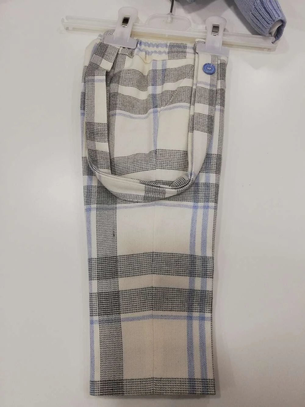 CAMICIA BIANCA CON BOTTONCINI AZZURRI E PAPILLON MAGLIONCINO DOPPIOPETTO AZZURRO PANTALONI BIANCHI A QUADRI