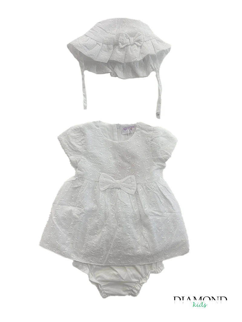 Completo 3 pezzi: copripanolino, abito e cappellino.