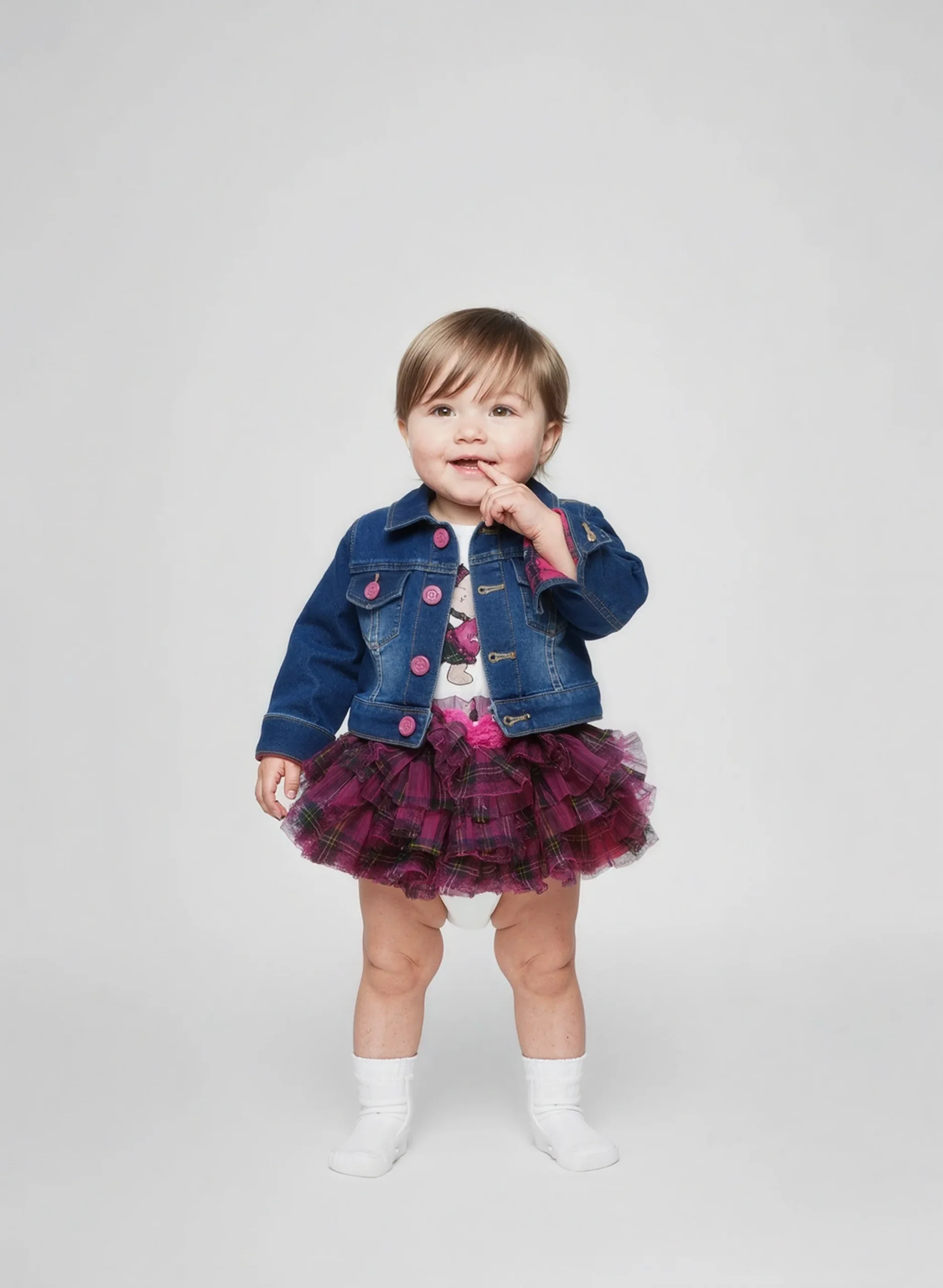 ( stagione autunno inverno ) Completo 3 pezzi. T-shirt manica lunga con bottoncini e stampa frontale. Giubbino di jeans con orsetto applicato e bottoni in contrasto colore. Gonna scozzese a balze in tulle con elastico in vita e fiocco strass. Tabella taglie 3/6mesi 64cm 6/9mesi 72cm 9/12mesi 78cm 12/18mesi 84cm 18/24mesi 90cm
