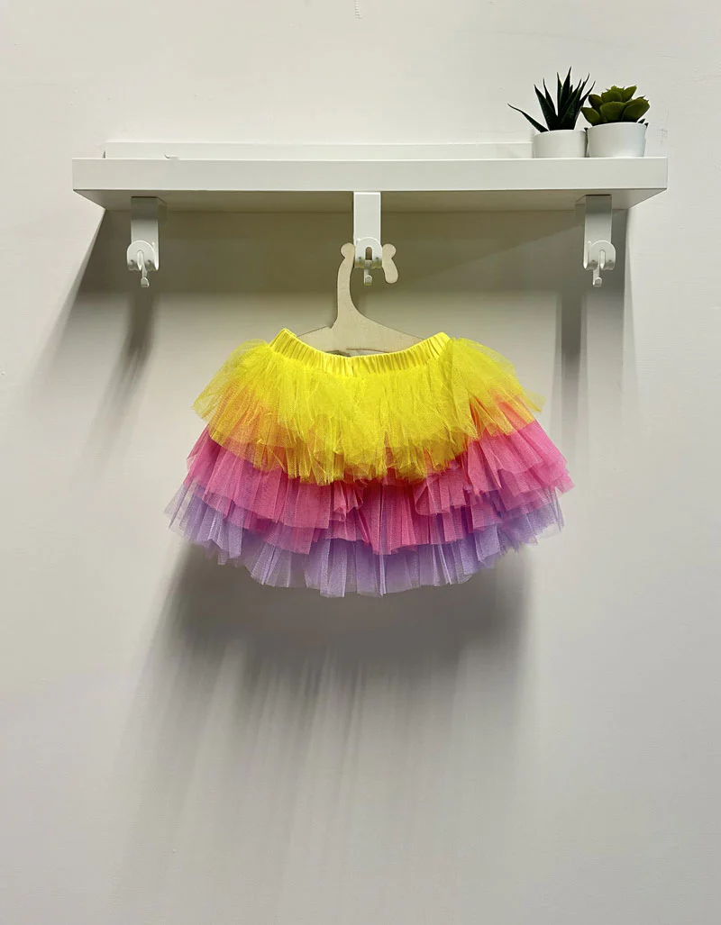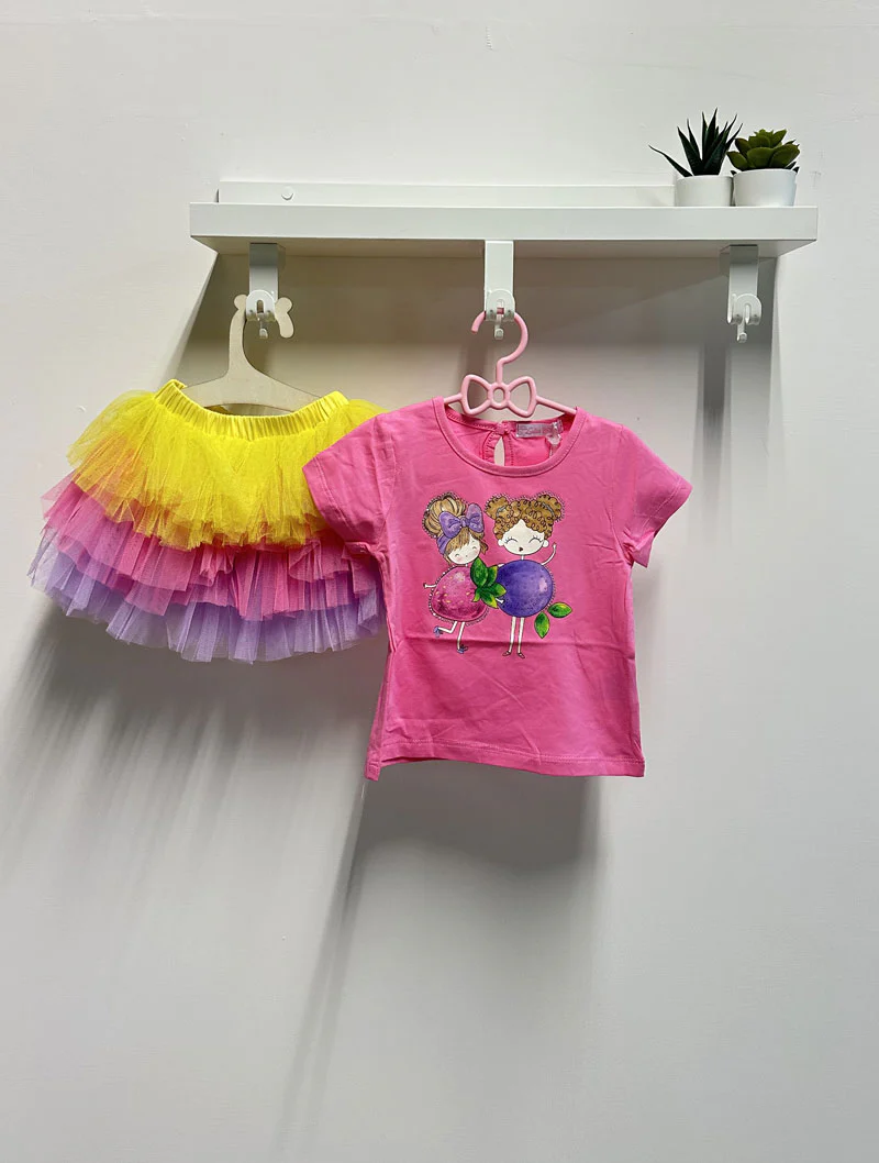 ( stagione Primavera Estate ) Completo composto da gonna e t-shirt. T-shirt mezza manica con bottoncini sulla spalla e stampa frontale. Gonna in tulle multicolor con elastico in vita. Composizione: t-shirt: 95% cotone 5% elastane gonna: 100% poliestere Tabella taglie 12 mesi 74cm 18 mesi 80cm 24 mesi 92cm 30 mesi 96cm 36 mesi 100cm