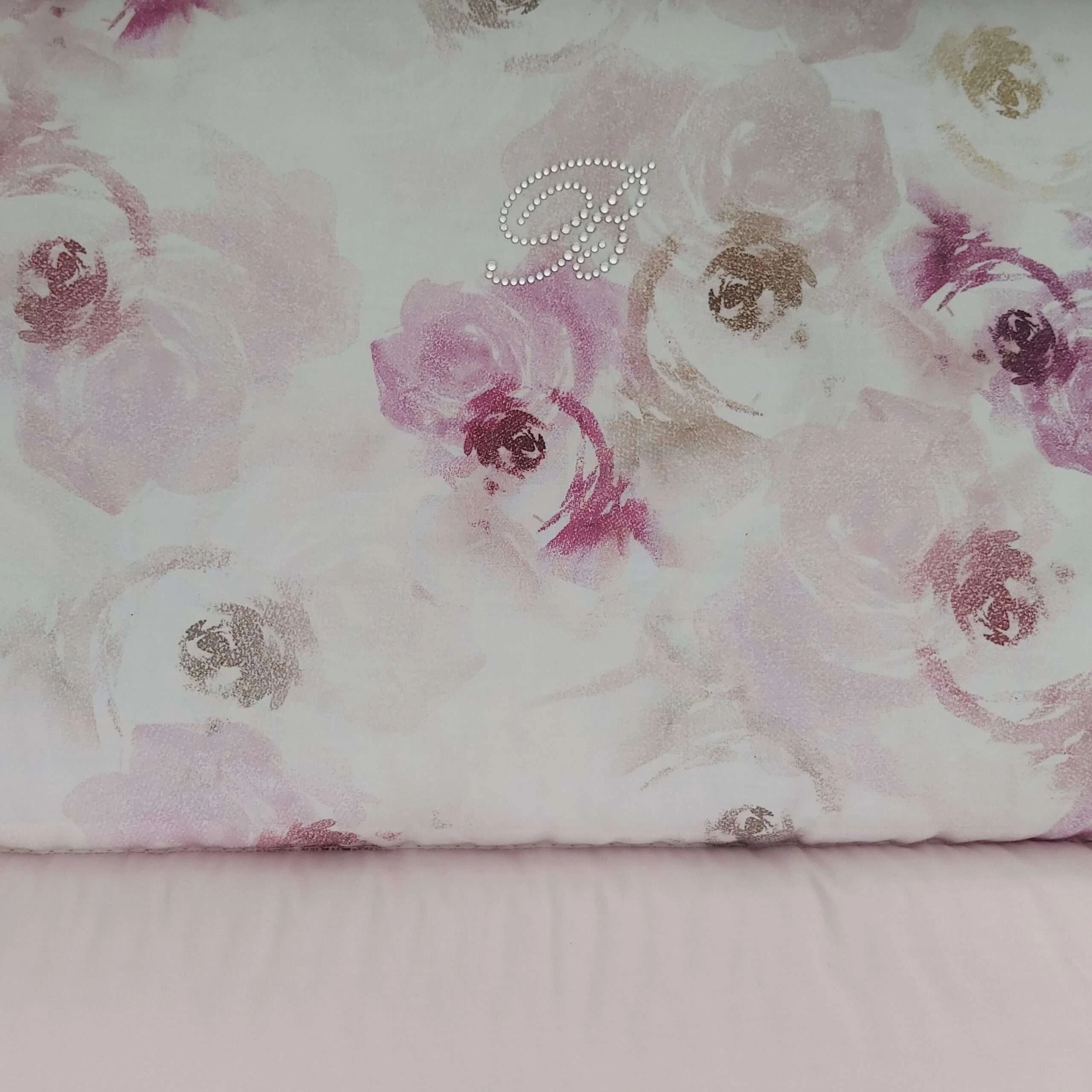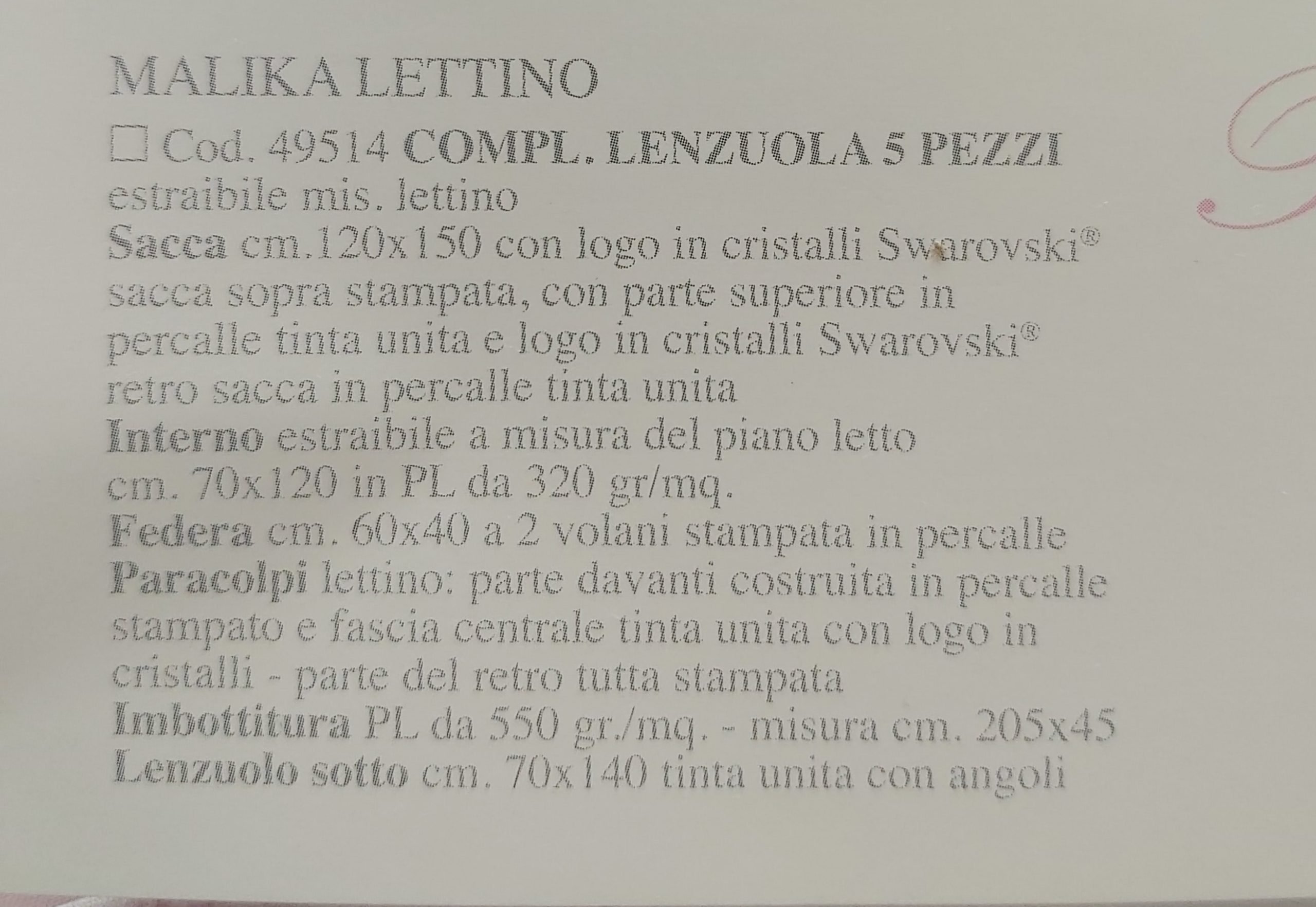 Completo 5 pezzi Sacca 120×150 con logo cristalli swarovsky. Interno estraibile misura del piano letto 70×120. Federa 60×40 Lenziolo sotto 70×140 Paracolpi inclusi.