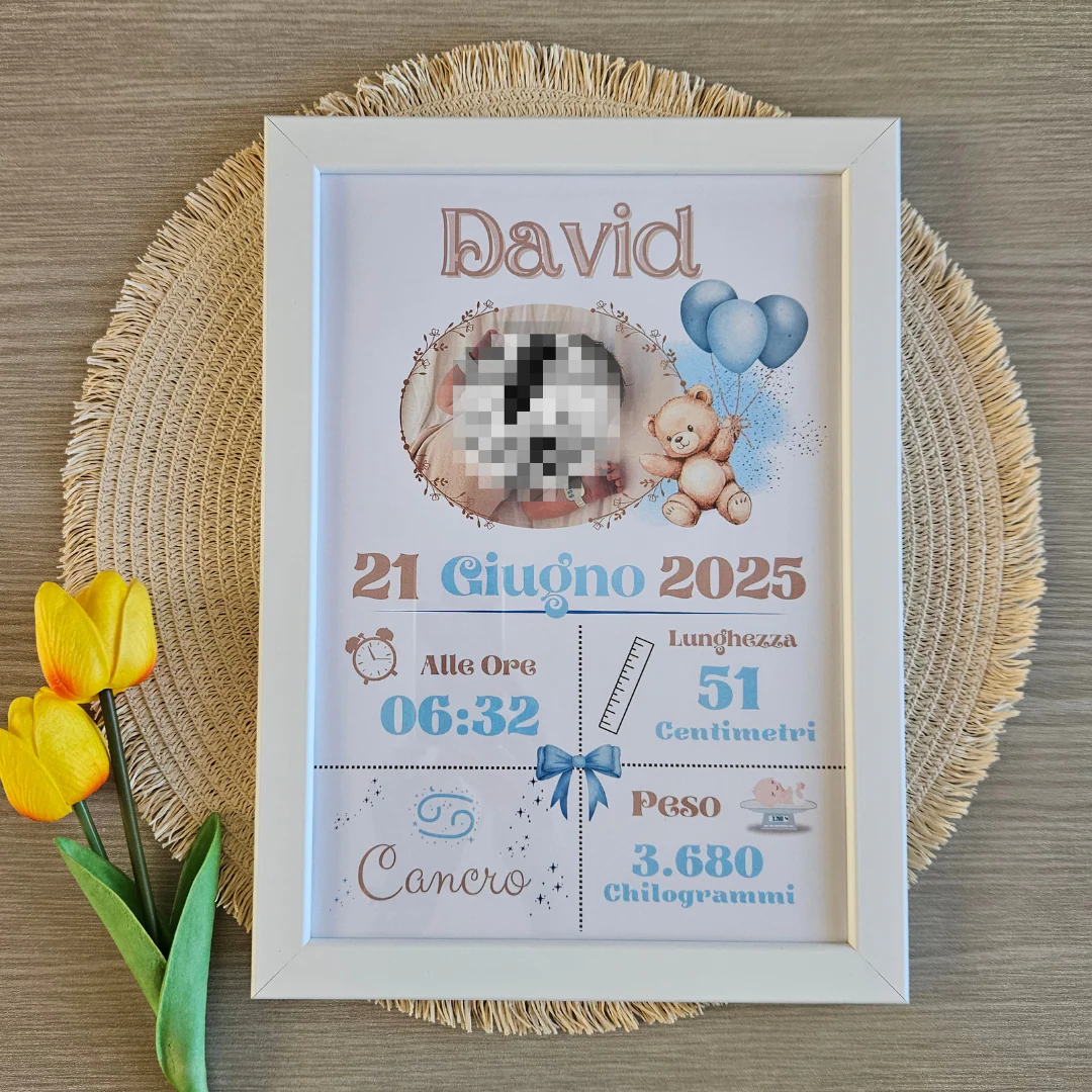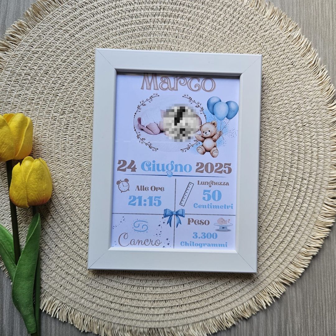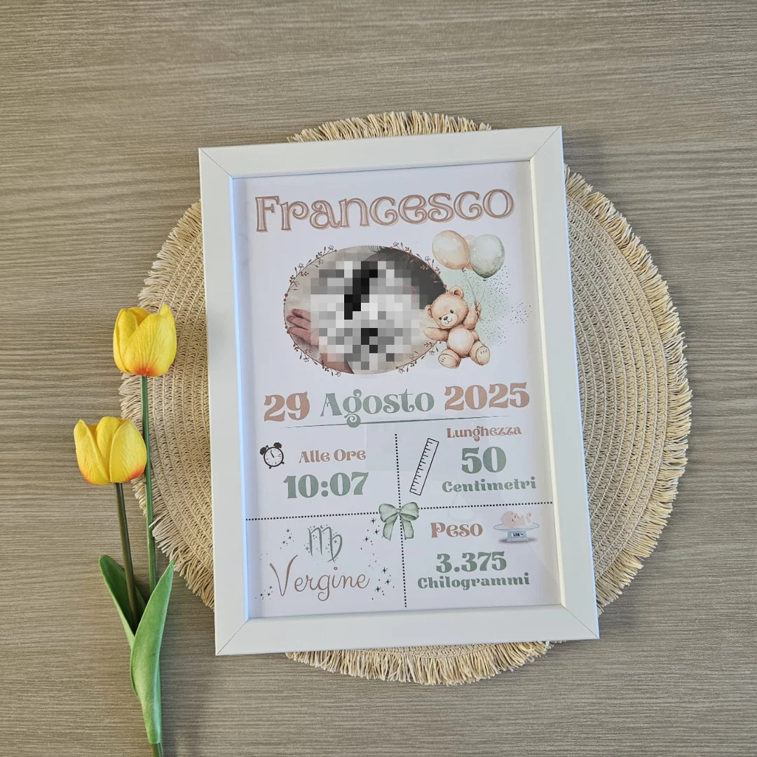 Personalizzabile con la foto del tuo tesoro e arricchita dai dettagli preziosi della nascita, come: