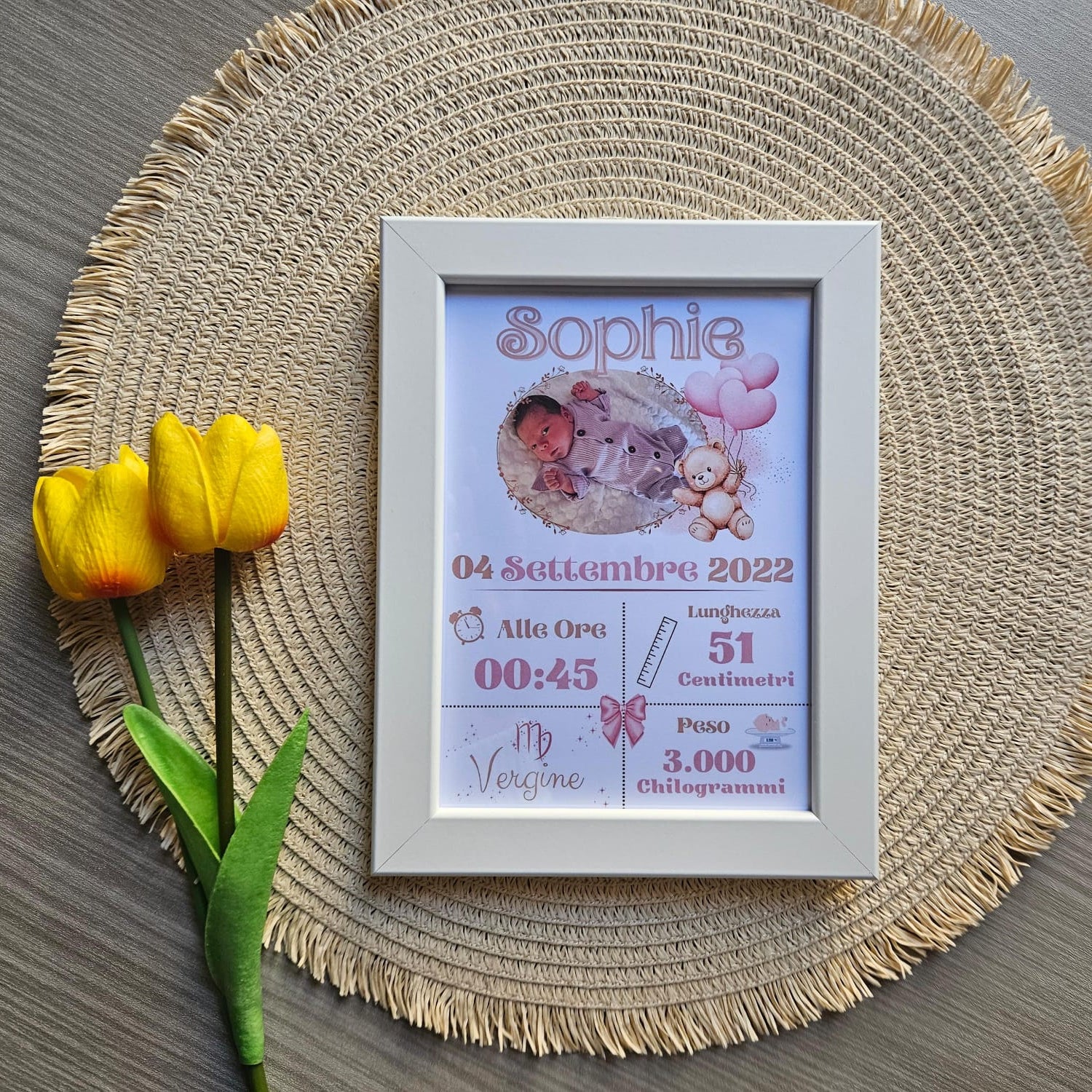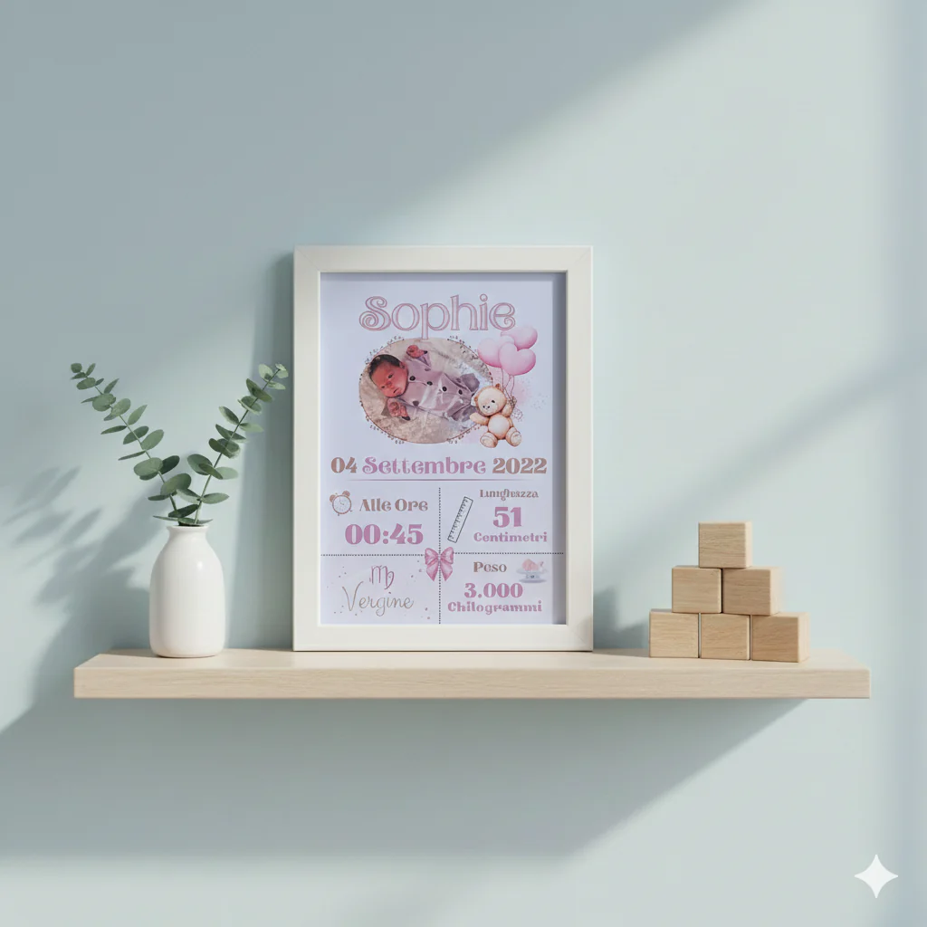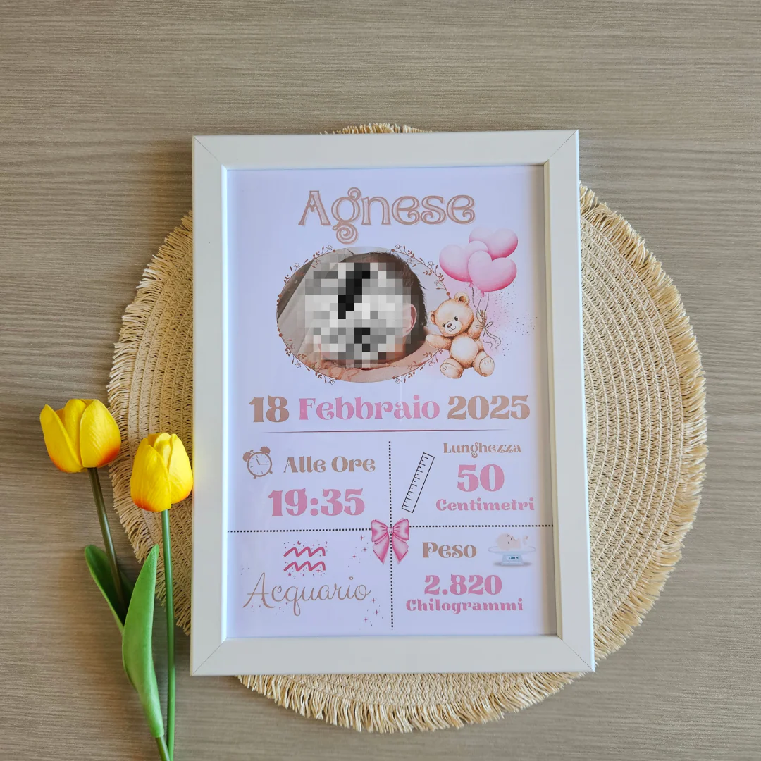 Personalizzabile con la foto del tuo tesoro e arricchita dai dettagli preziosi della nascita, come: