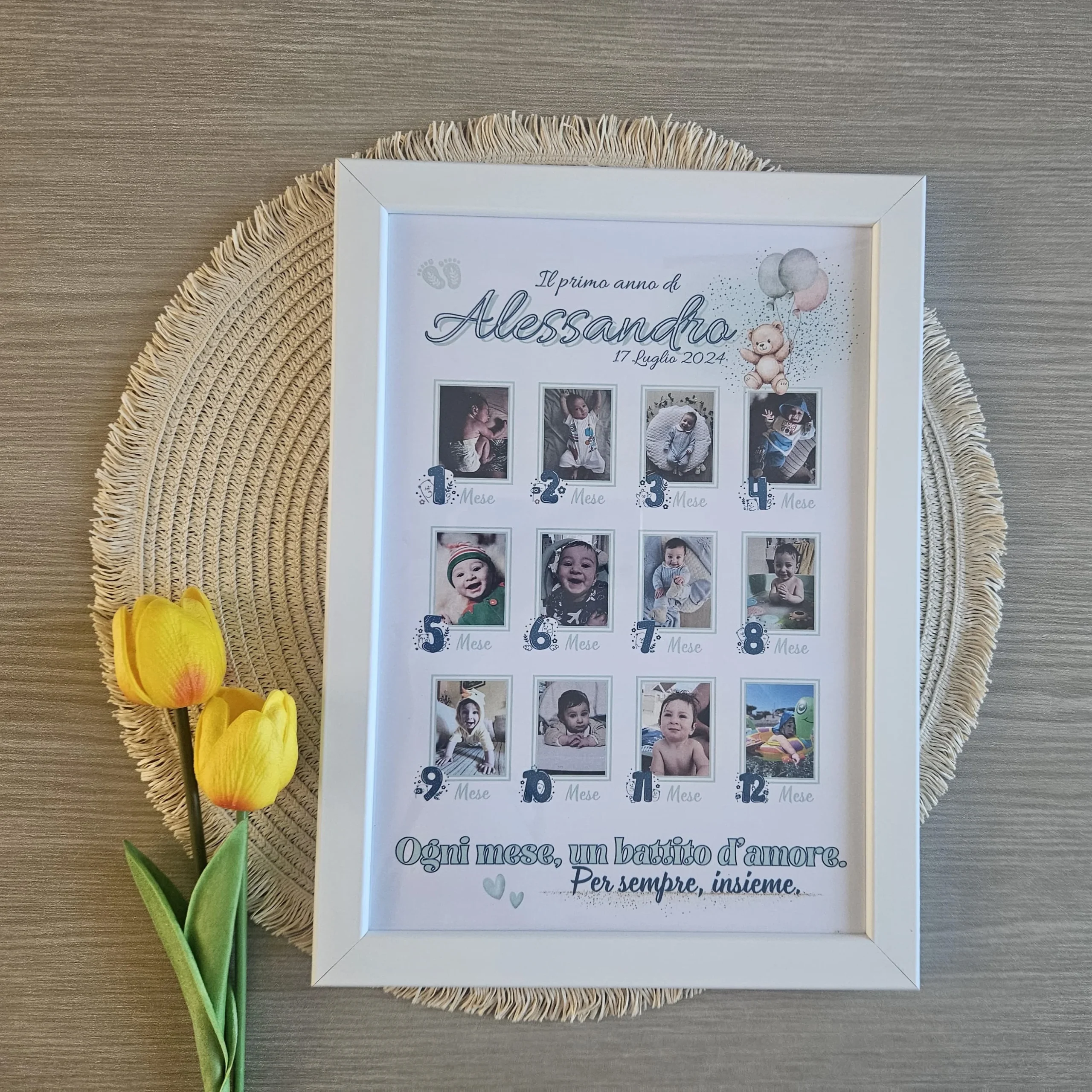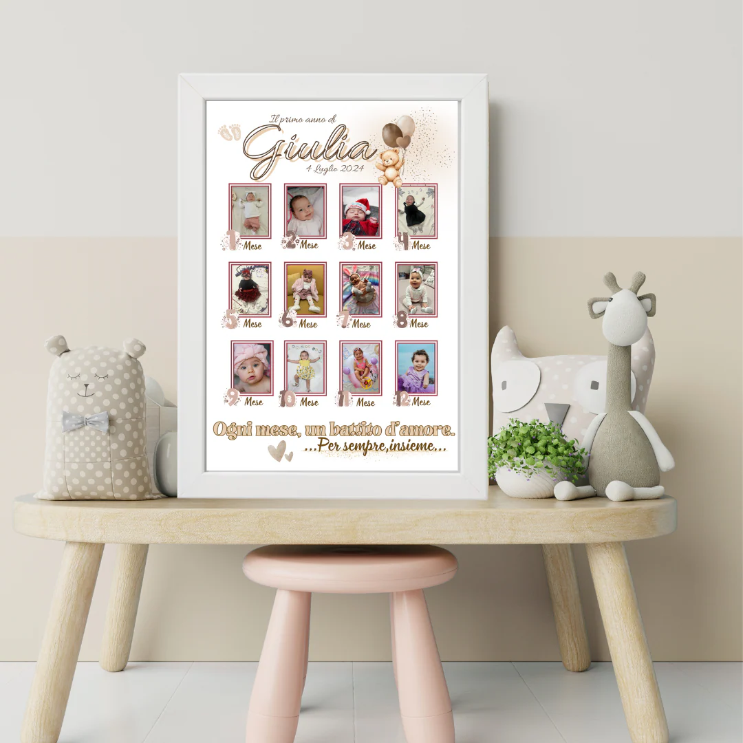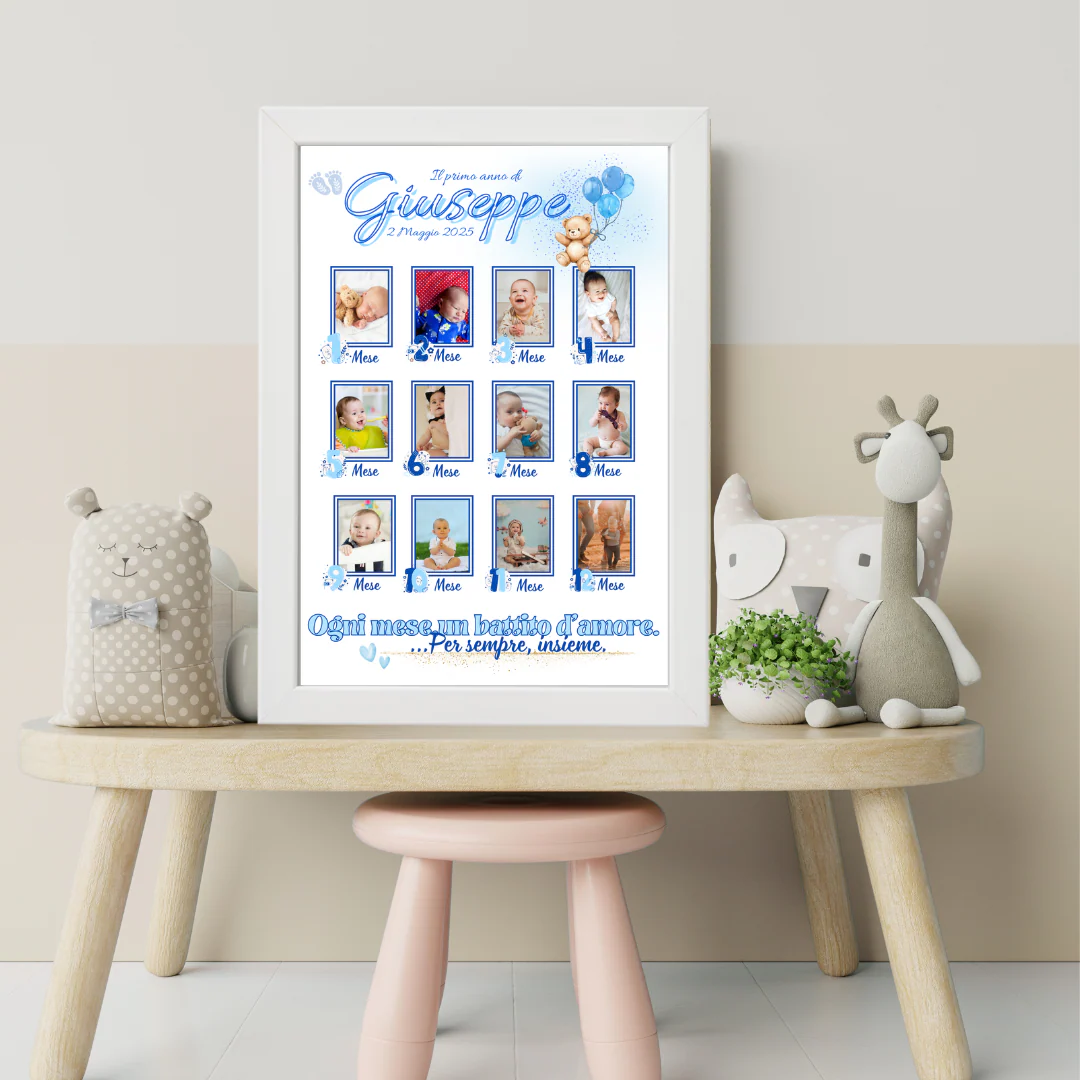 Dal giorno magico della nascita, con quella primissima foto che ti scalda il cuore, fino ai suoi primi passi e al suo primo compleanno. Questa cornice personalizzata è progettata per ospitare 12 momenti preziosi: la foto del giorno in cui tutto è iniziato e una per ogni mese successivo, fino a celebrare il suo primo, anno indimenticabile. Un racconto visivo della crescita, un concentrato di amore e tenerezza.