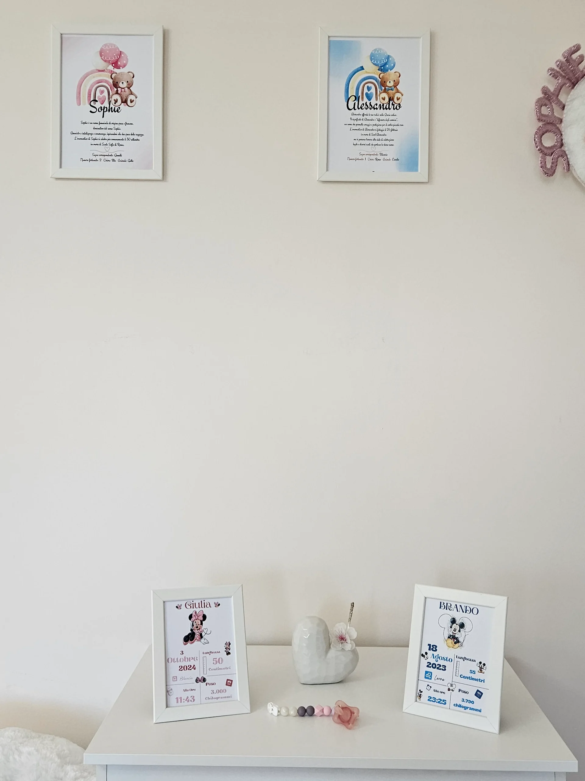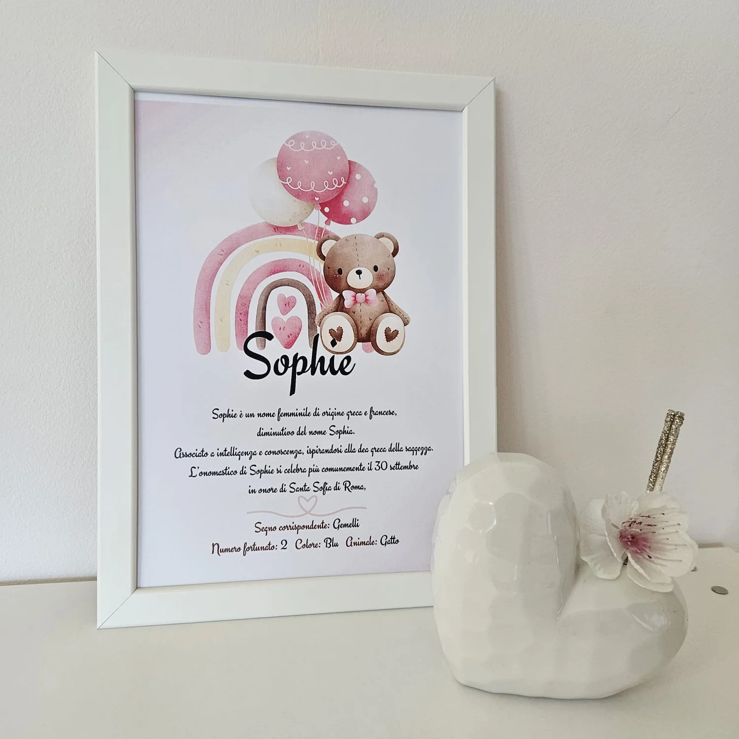 Un regalo prezioso che racconta la storia di un nome, scelto con amore da mamma e papà. La nostra cornice bianca personalizzabile è perfetta per arricchire ogni ambiente della casa, sia come soprammobile che da appendere alla parete. Disponibile in due eleganti misure (18×13 cm e 30×21 cm), questa cornice non è solo un oggetto decorativo, ma un omaggio unico al nuovo arrivato.