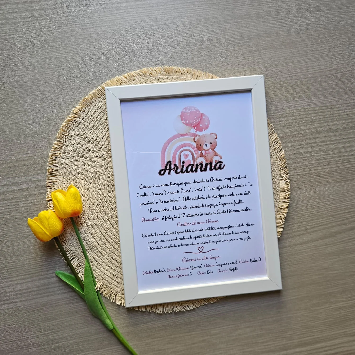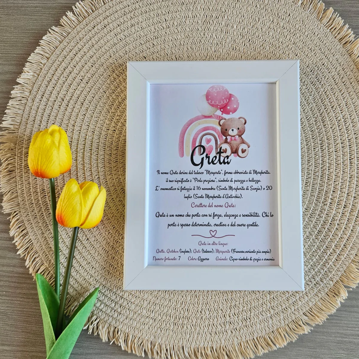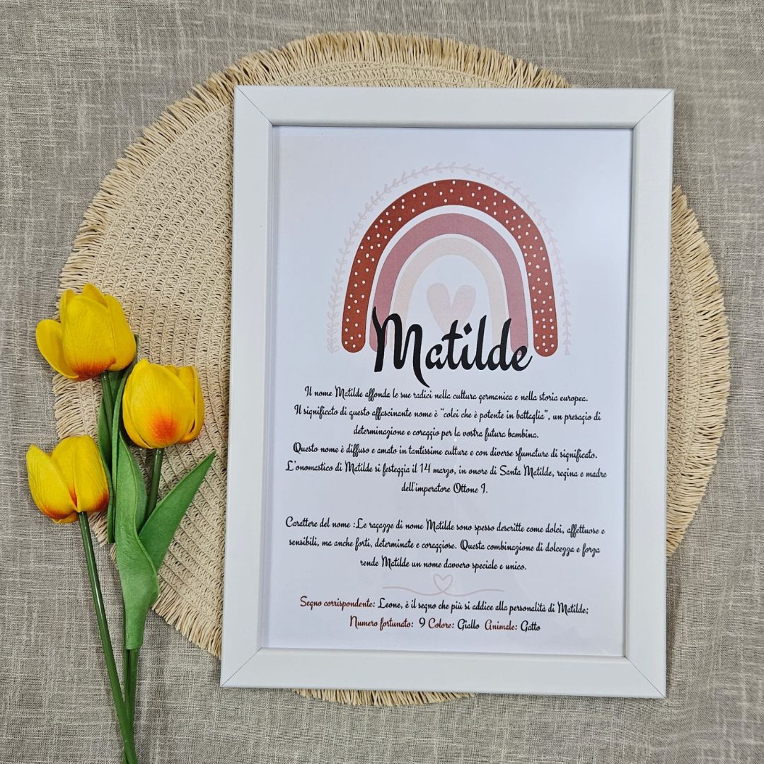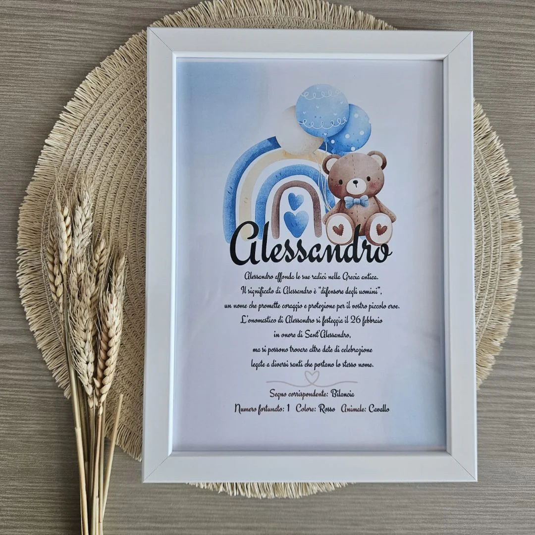 Con la nostra cornice, potrete aggiungere il nome del vostro bambino/ae una breve descrizione del suo significato, accompagnata dalle caratteristiche che lo rendono speciale:- Onomastico: la data speciale da celebrare.