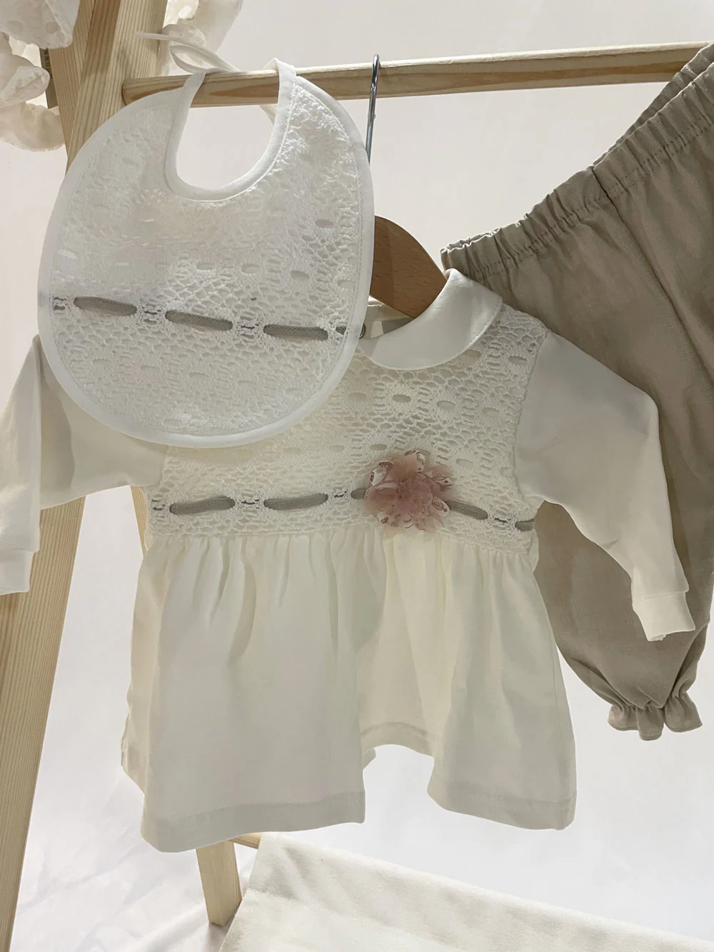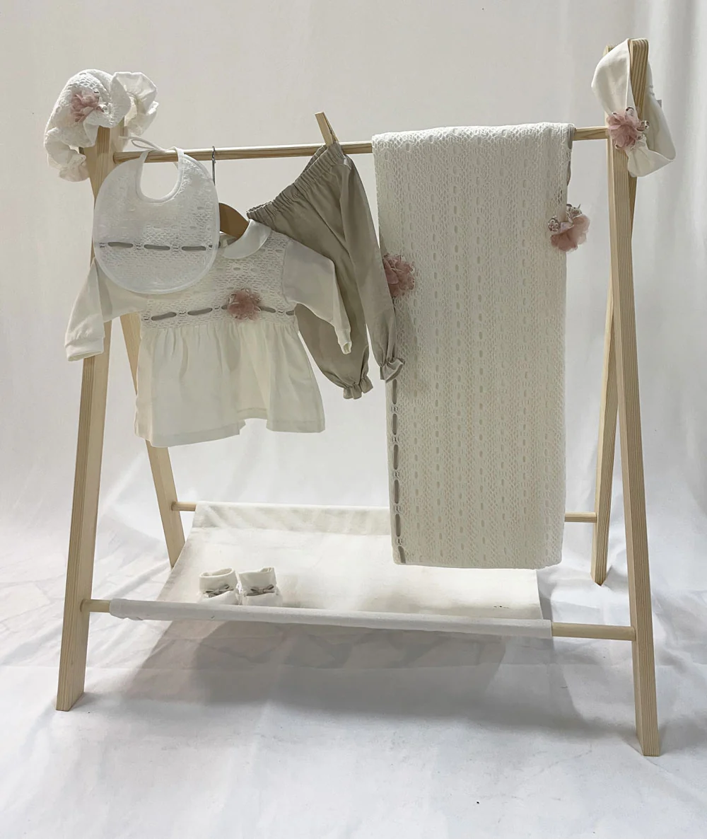 Corredino composto da: tutina, bavetta, cuffietta, scarpine, fascia e coperta.