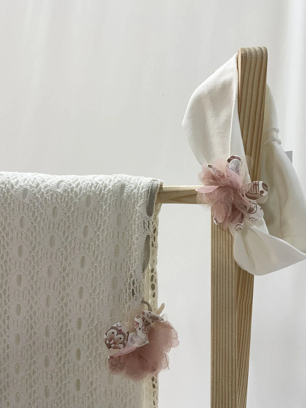 Copertina 95x75cm con fiore rosa e nastrino in contrasto.