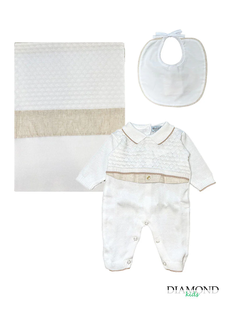 Tutina bianca e beige con inserto in lino beige e dettagli ricamati.