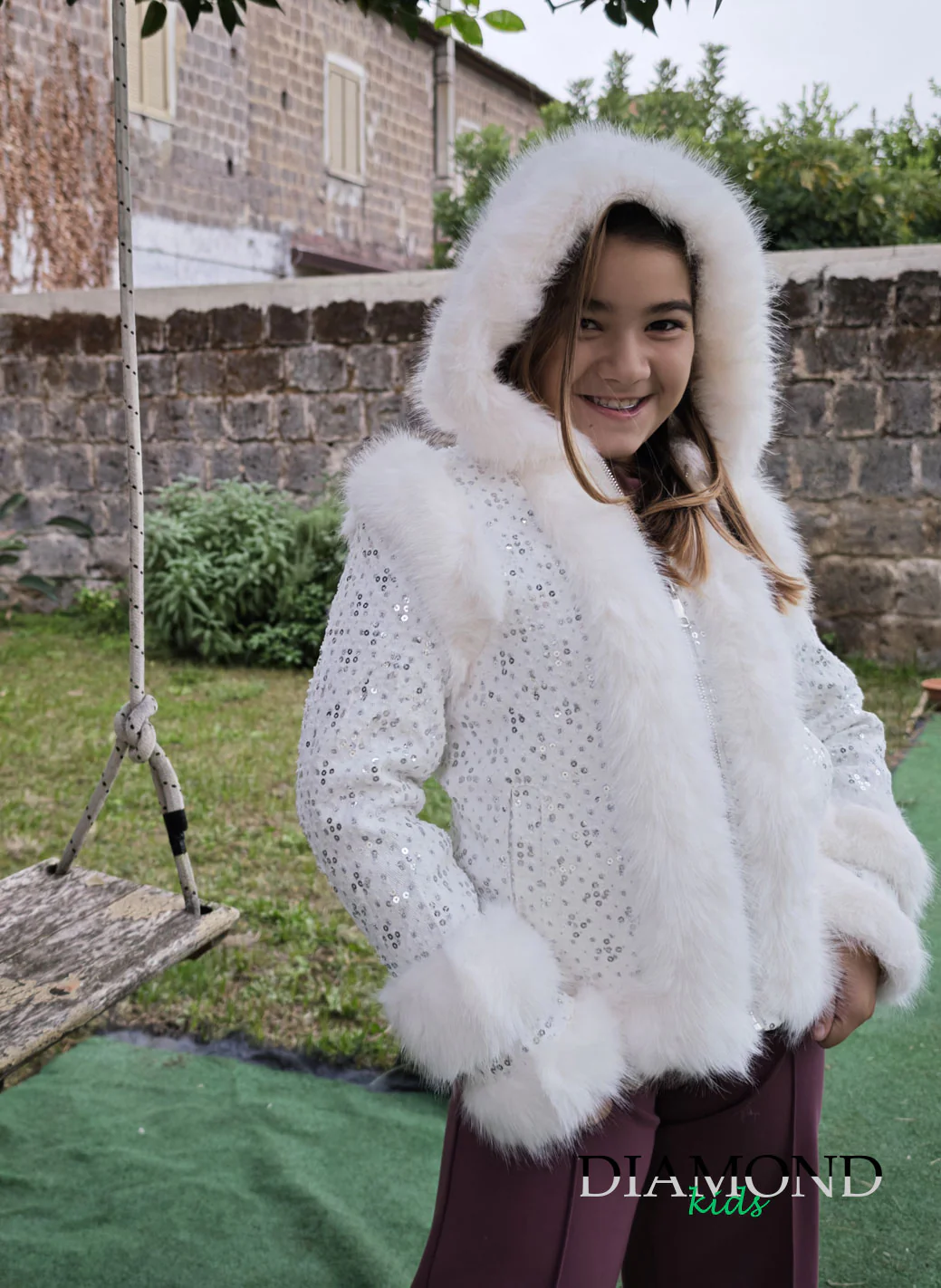 ( stagione Autunno Inverno ) Ecopelliccia con paillettes. Chiusura con zip e tasche, cappuccio. Pelliccia su cappuccio, fondo e fondo manica. Composizione: ecopelliccia Tabella taglie 4 anni 104cm 6 anni 111cm 8 anni 128cm 10anni 140cm 12anni 152cm 14anni 164cm