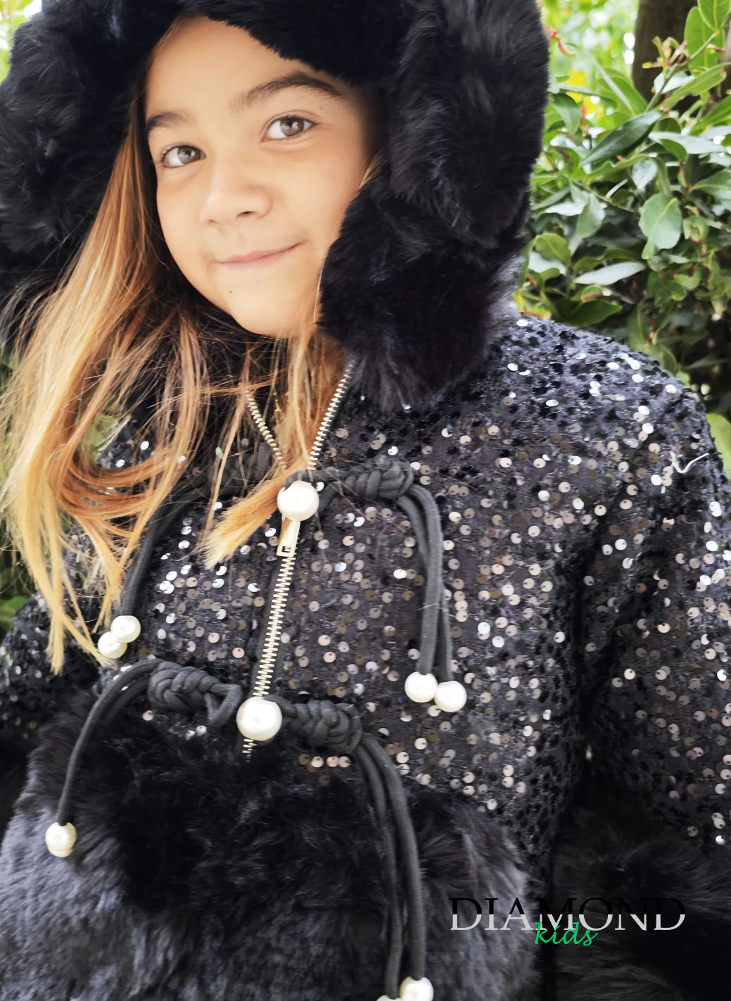( stagione Autunno Inverno ) Ecopelliccia con paillettes e maxi cappuccio. Fondo in pelliccia. Chiusura con zip e ganci con perle. Composizione: ecopelliccia Tabella taglie 4 anni 104cm 6 anni 111cm 8 anni 128cm 10anni 140cm 12anni 152cm 14anni 164cm