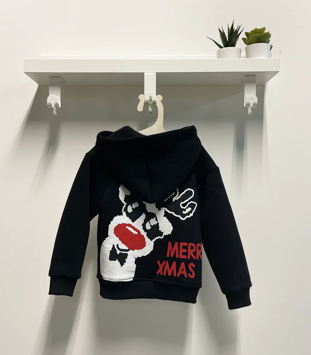 ( stagione autunno inverno ) Felpa con cappuccio. Interno felpato, tasca a marsupio frontale. Retro con stampa renna Merry XMAS. Composizione: 90% cotone 10% poliestere Tabella taglie 12 mesi 74cm 18 mesi 80cm 24 mesi 92cm 30 mesi 96cm 36 mesi 100cm