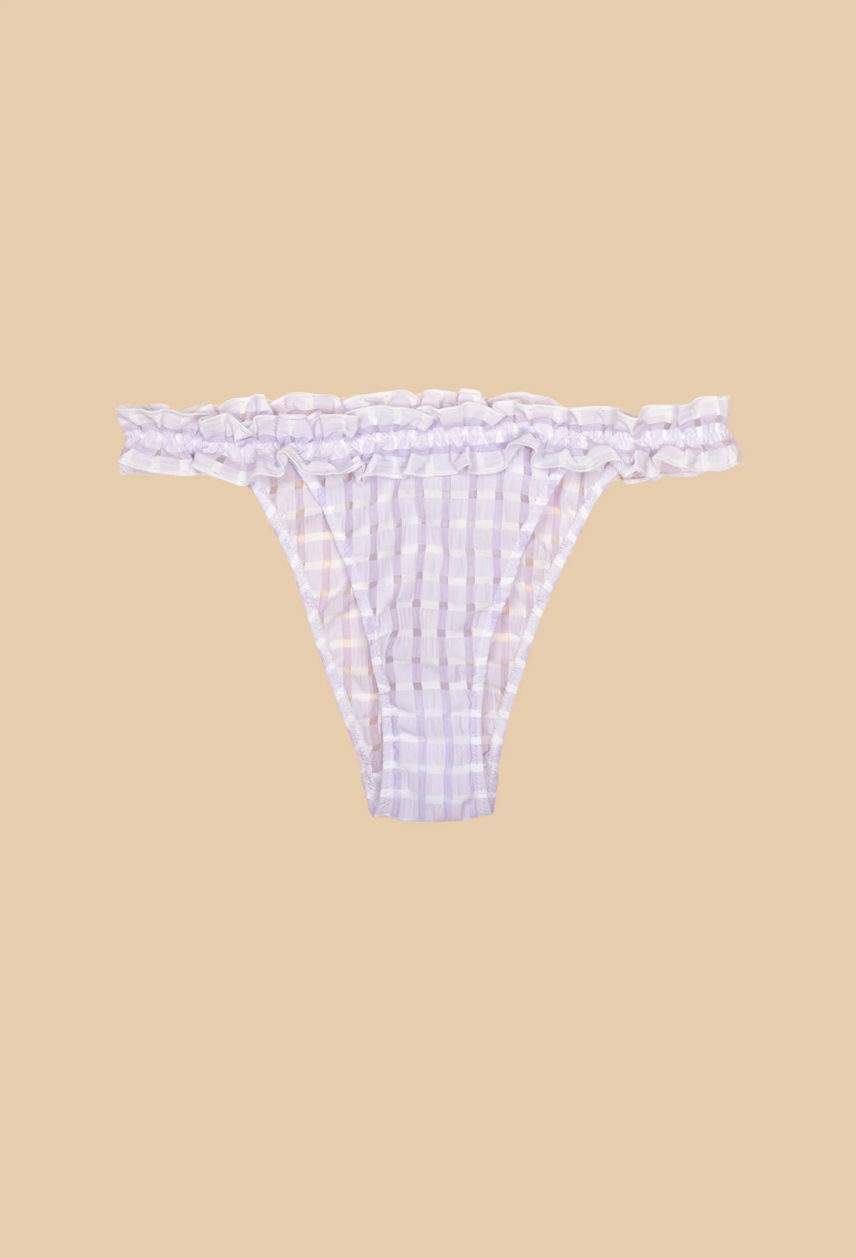 Una trama morbida, leggermente trasparente, di vichy lilla caratterizza il nostro Heidy, luminoso come le sere d’estate!