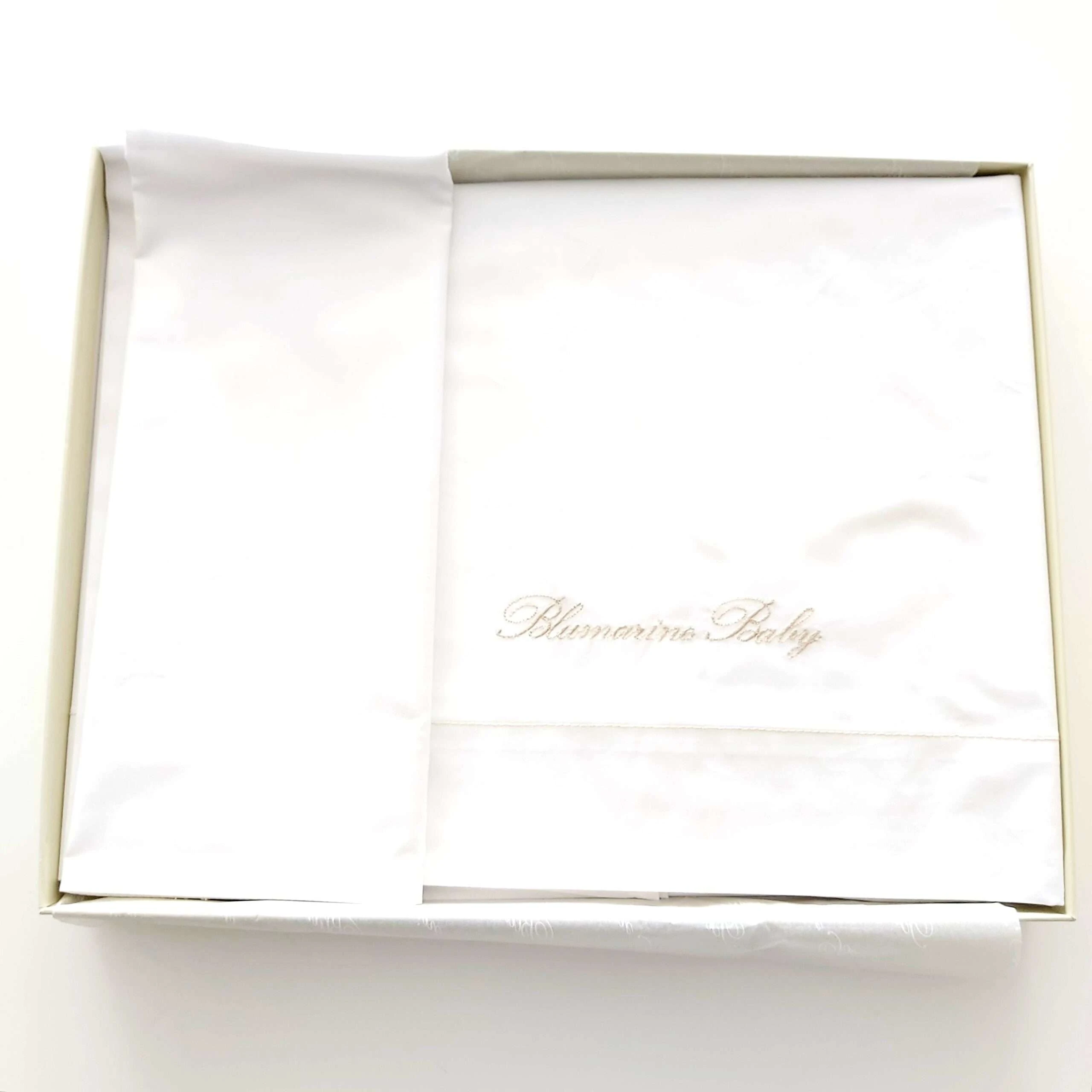 Completo blumarine Lenzuola tinta unita con logo ricamato Set 3 pezzi formato da: Lenzuolo sopra 120×180 cm tinta unita con ricamo e logo con cristalli swarovsky Federa 60×40 cm a 2 volani a sacchetto con bordo larerale Lenzuolo sotto 70×40 cm con angoli