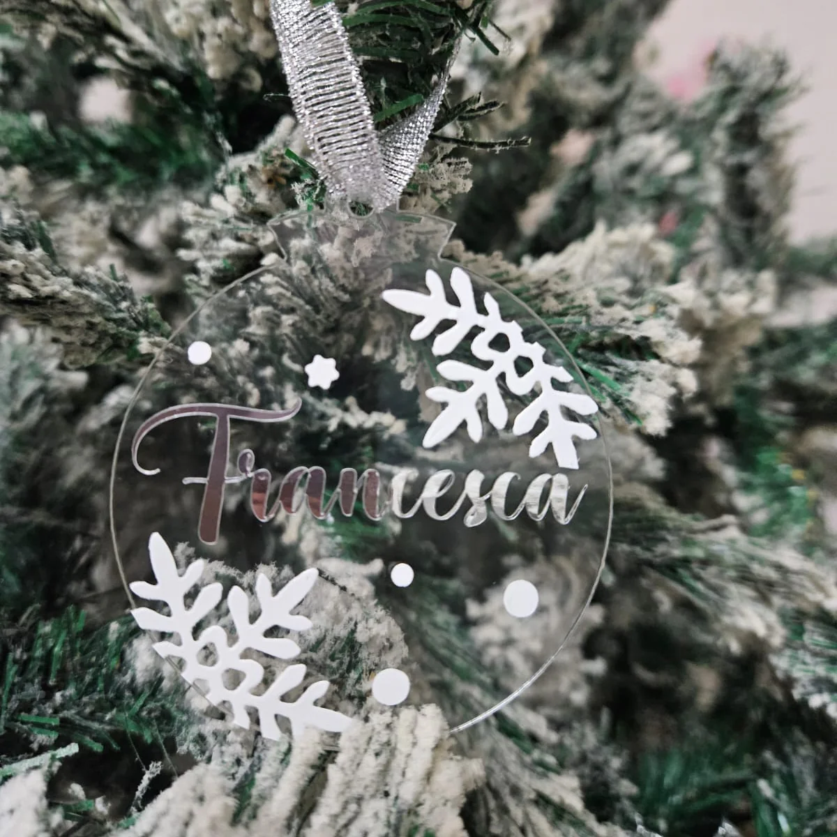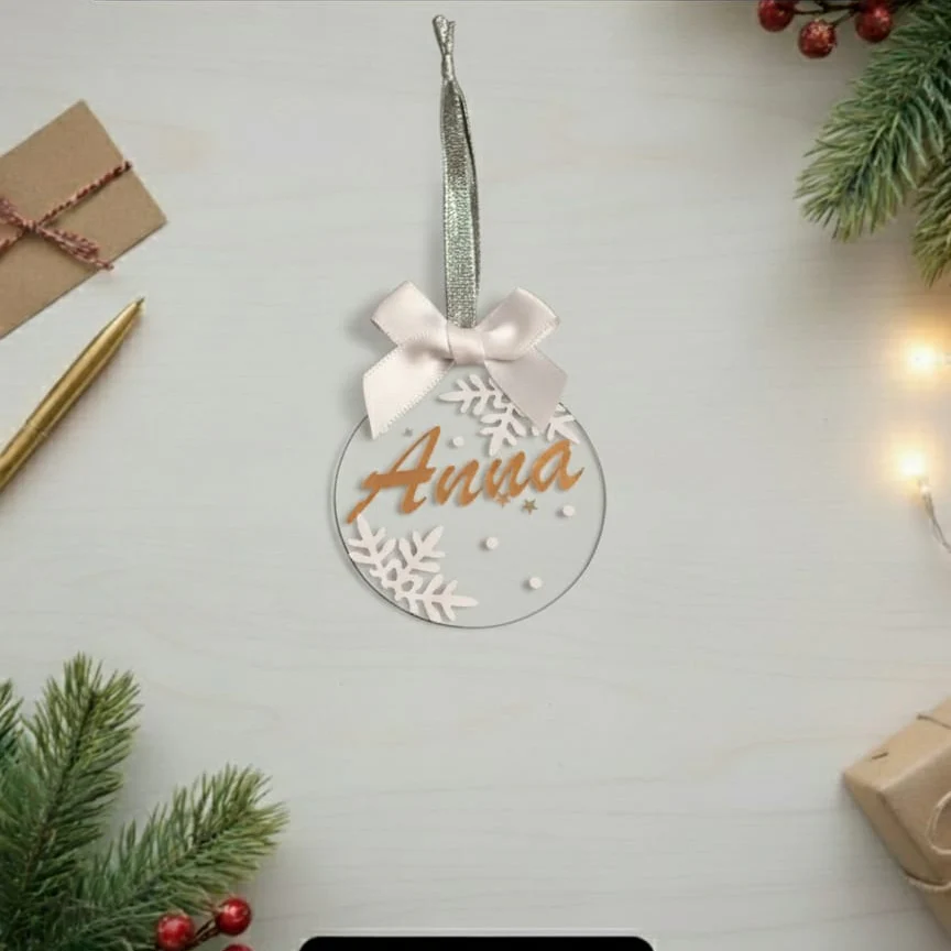 Rendi speciale il tuo Natale con le nostre eleganti palline in acrilico trasparente, personalizzate con il nome che desideri. Un dettaglio unico che celebra i tuoi affetti e aggiunge un tocco di magia al tuo albero.