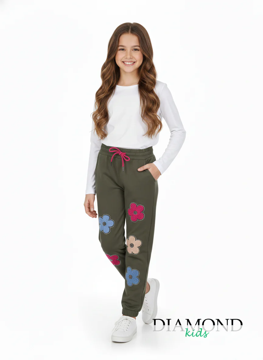 (stagione Autunno Inverno) Pantaloni tuta da bambina con elastico in vita. Tasche laterali ed elastico sul finale. Fiori decorativi di peluche con contorno di strass, e interno in caldo cotone. Composizione: 65% Cotone, 35% Poliestere Tabella taglie 4anni 104cm 6anni 111cm 8anni 128cm 10anni 140cm 12anni 152cm 14anni 164cm