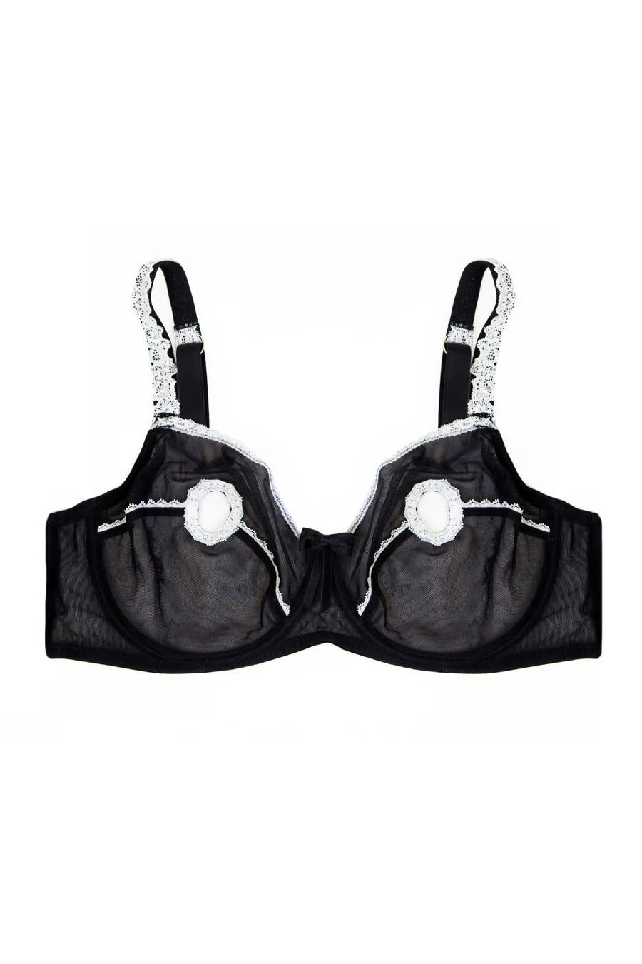 Il tulle nero velato è bordato di pizzo bianco in questo reggiseno sfoderato e non imbottito.