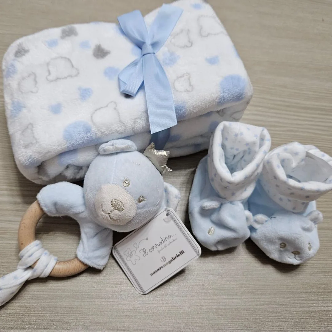 Rendi speciale il benvenuto a una nuova vita con la Confezione Regalo Neonato Nazareno Gabrielli , un set dolcissimo disponibile in rosa e azzurro. Questo elegante cofanetto include una copertina in pile decorata con tenere fantasie, un sonaglino con orsetto per le prime coccole e delle babbucce decorate per tenere al caldo i piedini del neonato. Un regalo perfetto, che unisce estetica e qualità, pensato per accompagnare il bambino nei suoi primi momenti di vita.