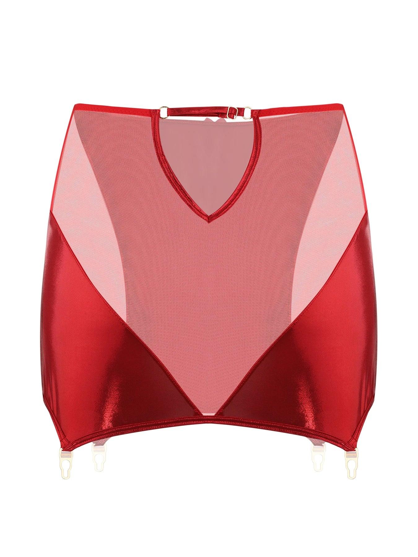 Questa gonna fa parte del set di lingerie Scarlet Seduction di baed Stories, un seducente completo realizzato in tessuto rosso trasparente con un rivestimento laccato lucido.