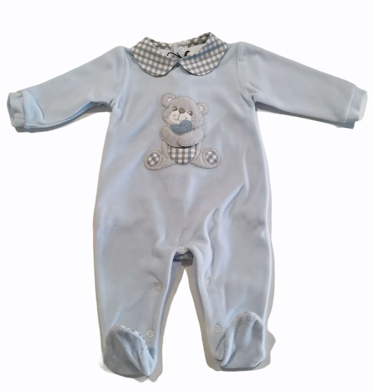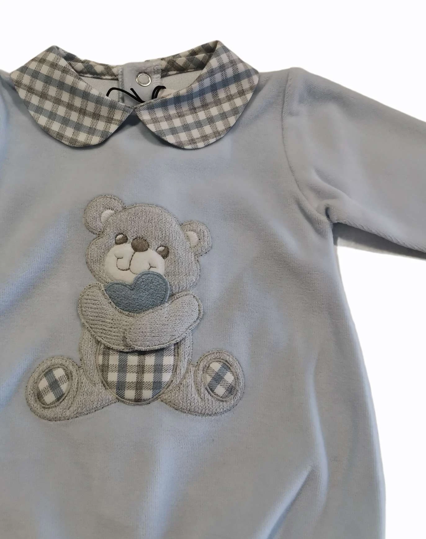 tutina in ciniglia azzurro con colletto e applicazione orsetto