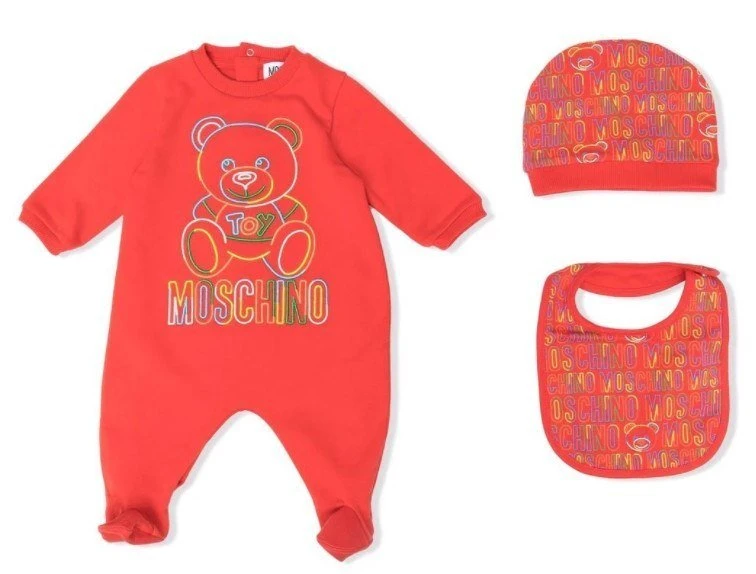 Set tutina Moschino in cotone con bavetta e cappello orsetto ricamato multicolor