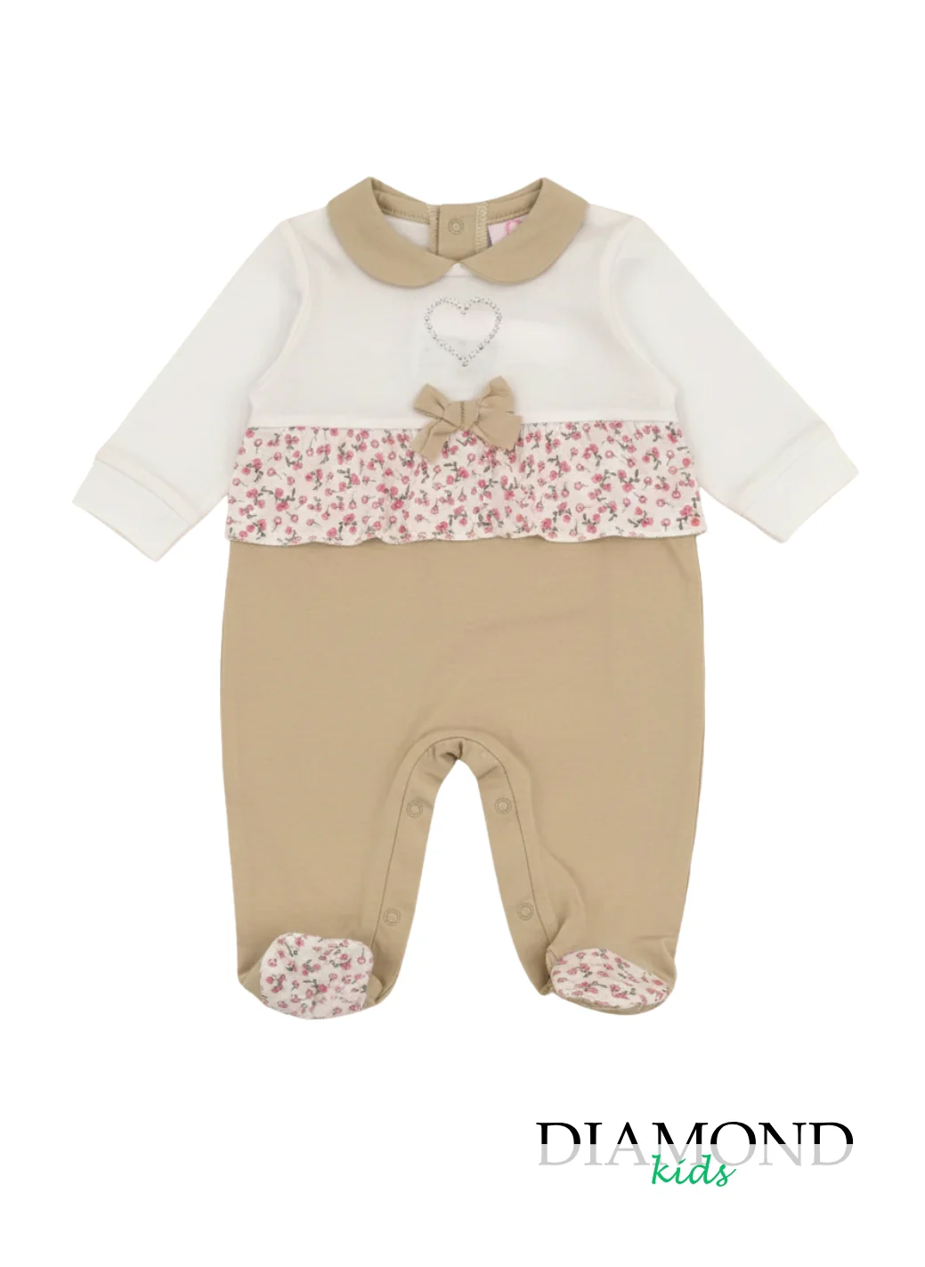 Colletto a contrasto, volant e piedini a fiorellini, fiocchetto applicato.