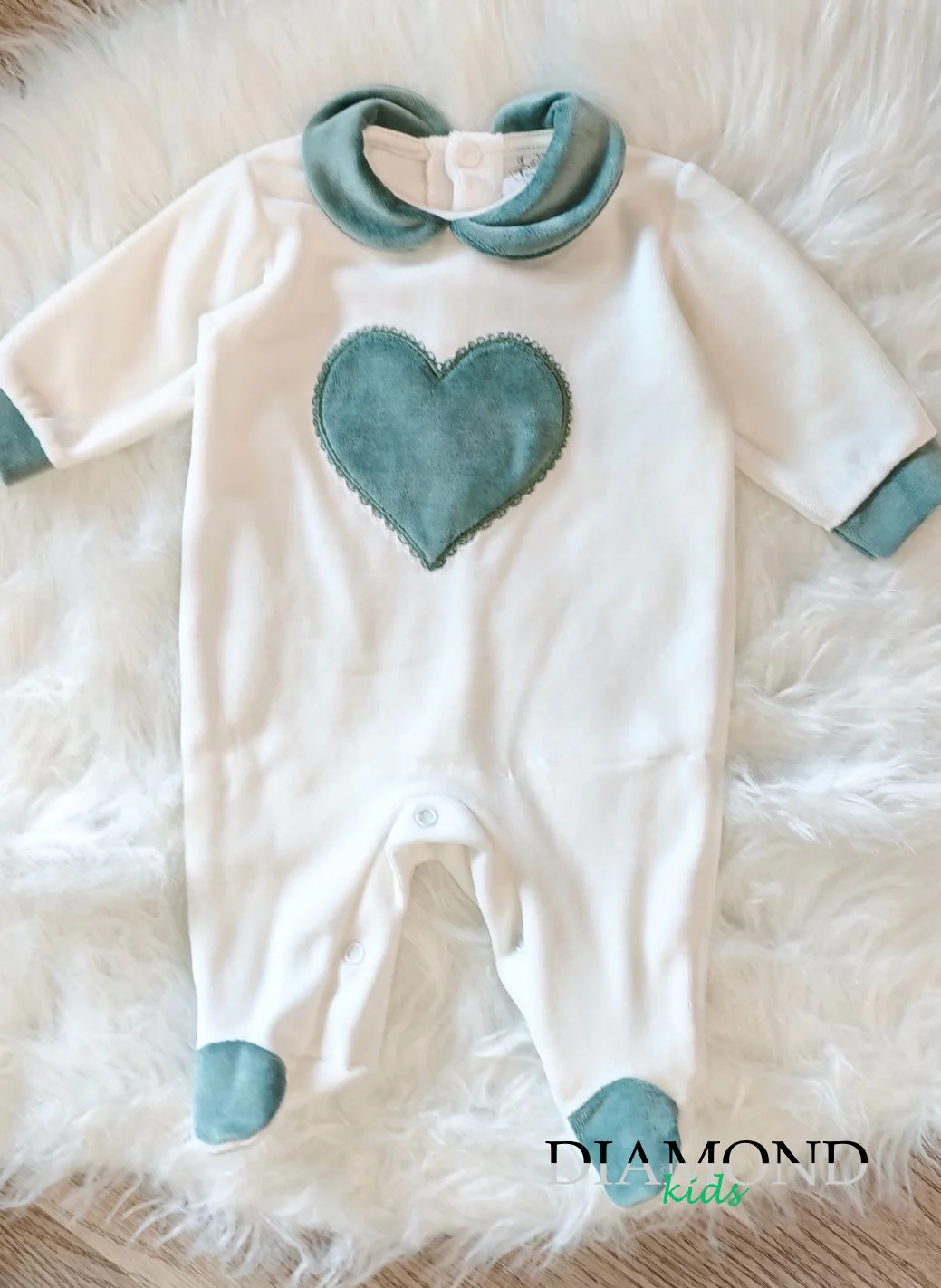 Tutina Neonata Cuore ciniglia bianca e verde salvia