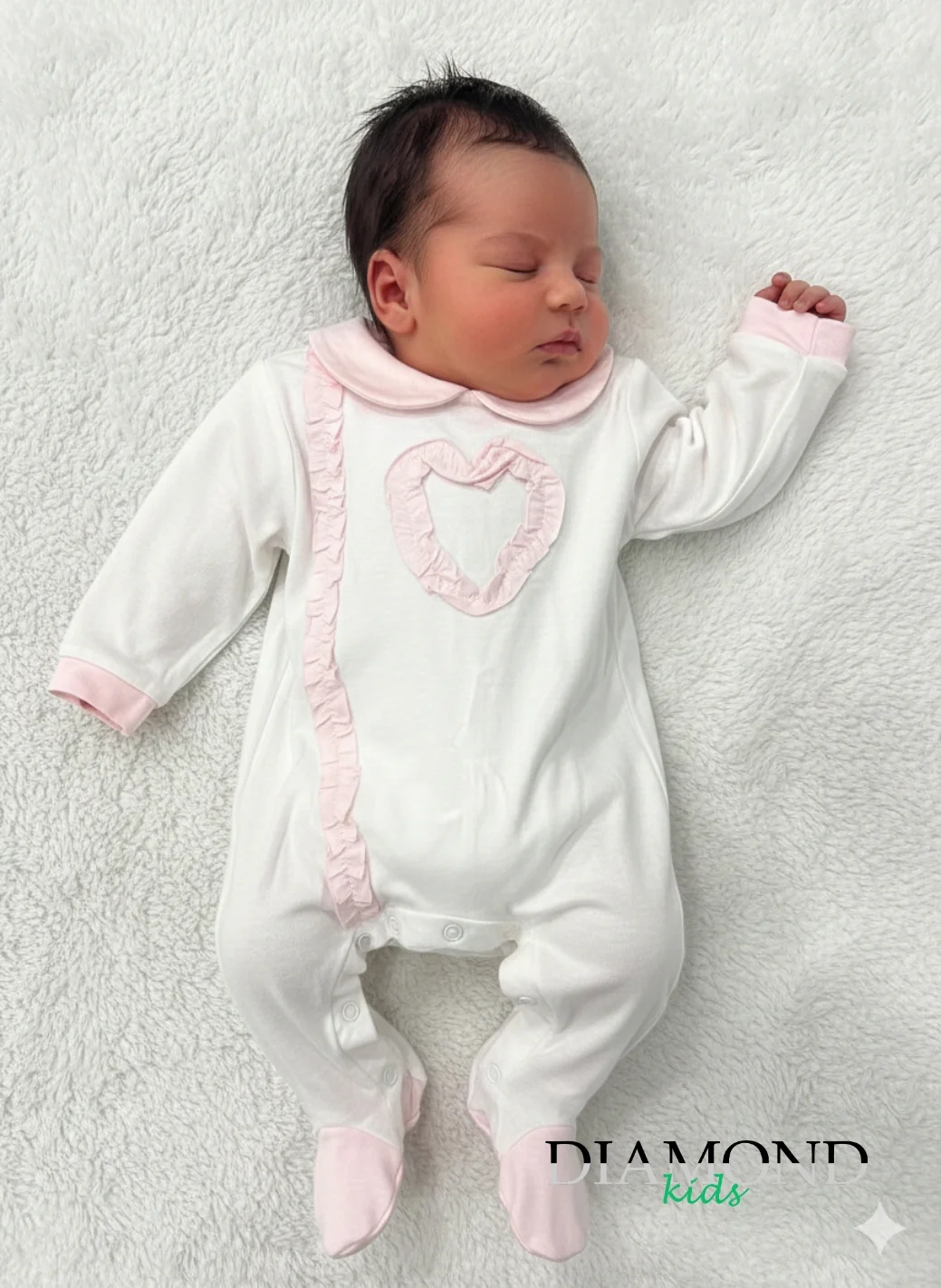 Chiusura con bottoni, colletto e piedini.
