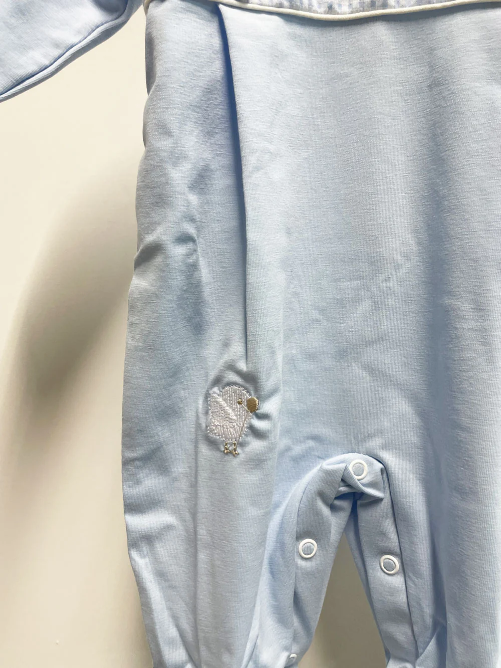 Uccellino ricamato sulla gamba.