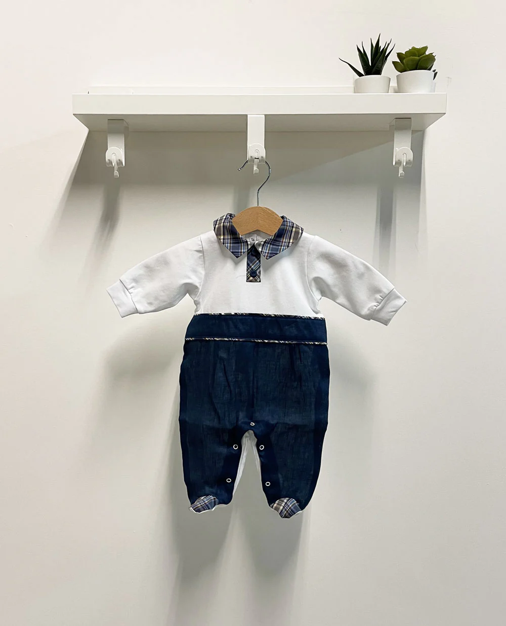 Tutina blu e bianca con parte inferiore blu e superiore bianca.