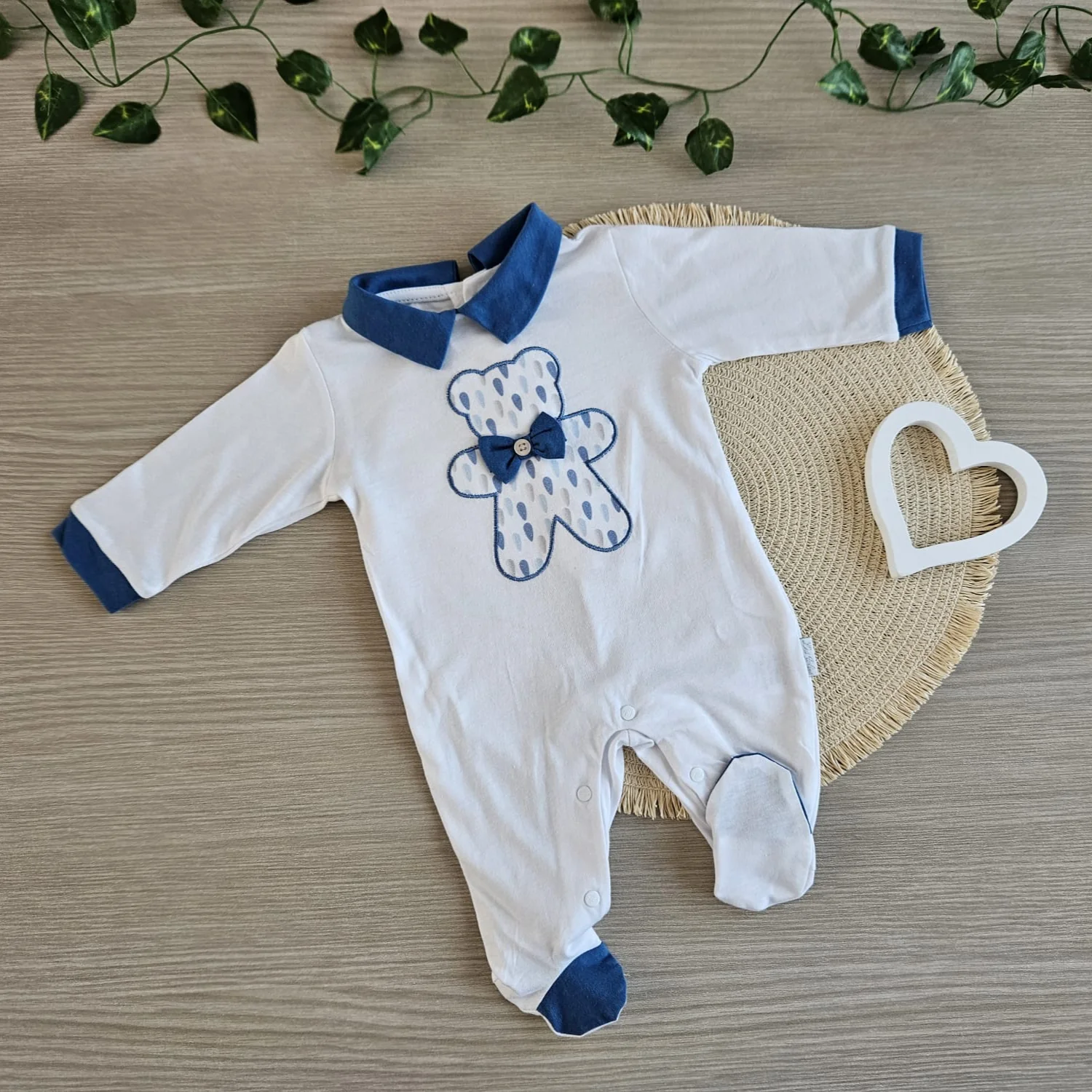 Il design bianco e celeste, unito al simpatico orsacchiotto, rende questa tutina adatto per ogni occasione: dai primi momenti in ospedale ,alla nanna e alle passeggiate quotidiane o per celebrare i momenti speciali.