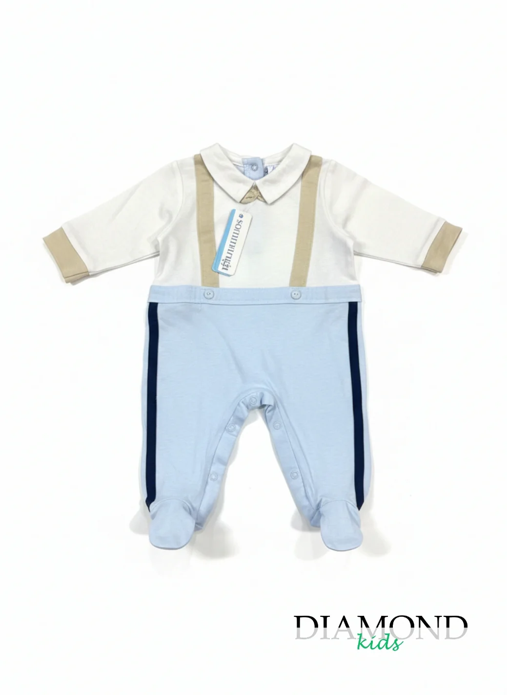 Chiusura con bottoni, colletto e piedini.