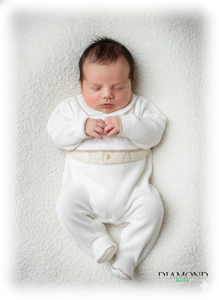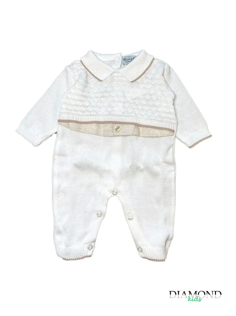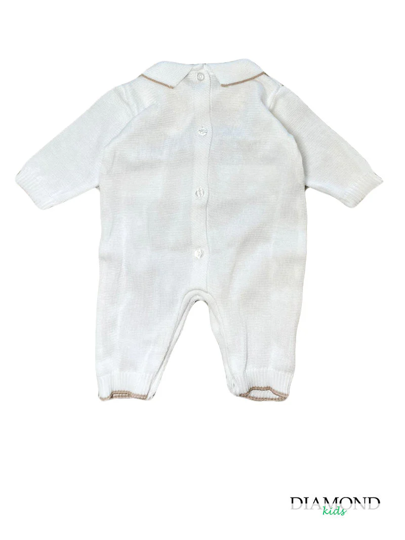 Tutina bianca e beige con inserto in lino beige e dettagli ricamati.